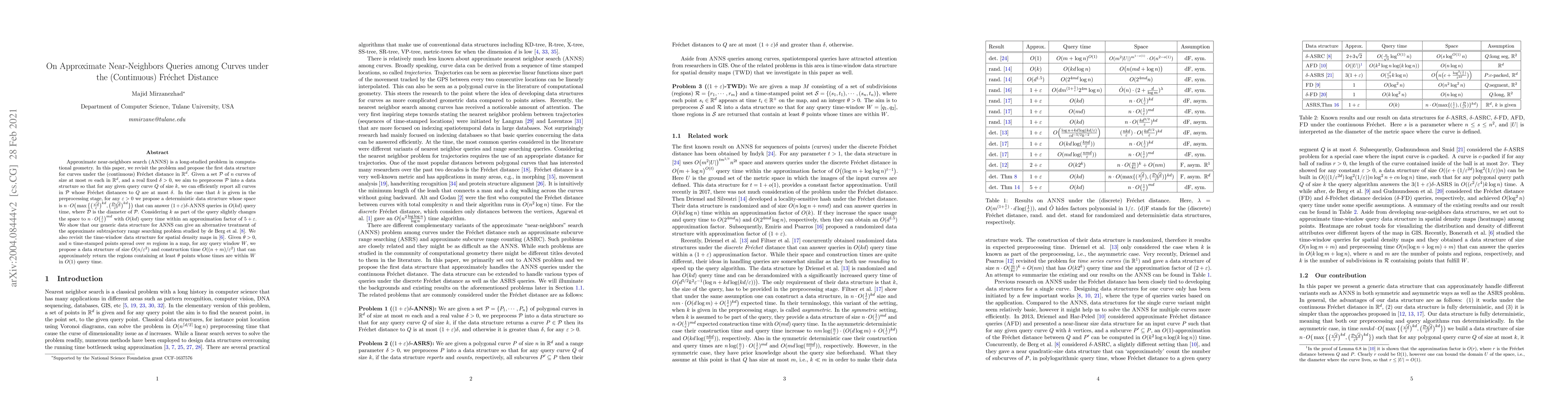 Approximate near-neighbors search (\textsc{ANNS}) is a long-studied problem in computational geometry. %that has received considerable attention by researchers in the community. In this paper, we revisit the problem and propose the first data structure for curves under the (continuous) Fr\'echet distance in $\Reals^d$. Given a set $\P$ of $n$ curves of size at most $m$ each in $\Reals^d$, and a real fixed $\delta>0$, we aim to preprocess $\P$ into a data structure so that for any given query curve $Q$ of size $k$, we can efficiently report all curves in $\P$ whose Fr\'echet distances to $Q$ are at most $\delta$. In the case that $k$ is given in the preprocessing stage, for any $\eps>0$ we propose a deterministic data structure whose space is $n \cdot O\big(\max\big\{\big(\frac{\sqrt{d}}{\eps}\big)^{kd}, \big(\frac{\D\sqrt{d}}{\eps^2}\big)^{kd}\big\}\big)$ that can answer \textsc{$(1+\eps)\delta$-ANNS} queries in $O(kd)$ query time, where $\D$ is the diameter of $\P$. Considering $k$ as part of the query slightly changes the space to $n \cdot O\big(\frac{1}{\eps}\big)^{md} $ with $O(kd)$ query time within an approximation factor of $5+\eps$. We show that our generic data structure for ANNS can give an alternative treatment of the approximate subtrajectory range searching problem studied by de Berg et al. [8]. We also revisit the time-window data structure for spatial density maps in [6]. Given $\theta>0$, and $n$ time-stamped points spread over $m$ regions in a map, for any query window $W$, we propose a data structure of size $O(n/\eps^2)$ and construction time $O((n+m)/\eps^2)$ that can approximately return the regions containing at least $\theta$ points whose times are within $W$ in $O(1)$ query time.