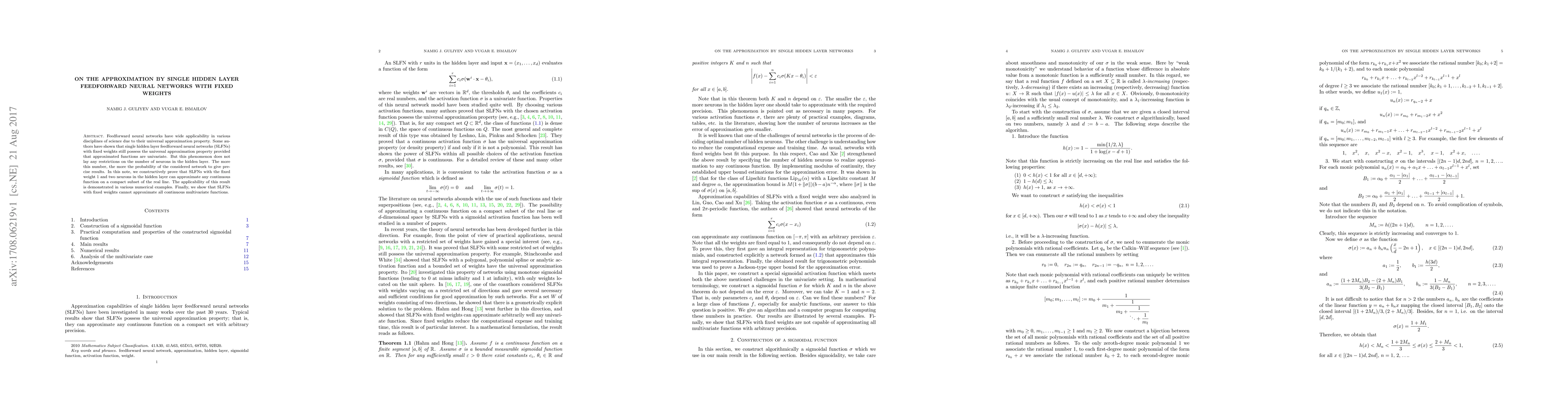 Feedforward neural networks have wide applicability in various disciplines of science due to their universal approximation property. Some authors have shown that single hidden layer feedforward neural networks (SLFNs) with fixed weights still possess the universal approximation property provided that approximated functions are univariate. But this phenomenon does not lay any restrictions on the number of neurons in the hidden layer. The more this number, the more the probability of the considered network to give precise results. In this note, we constructively prove that SLFNs with the fixed weight $1$ and two neurons in the hidden layer can approximate any continuous function on a compact subset of the real line. The applicability of this result is demonstrated in various numerical examples. Finally, we show that SLFNs with fixed weights cannot approximate all continuous multivariate functions.