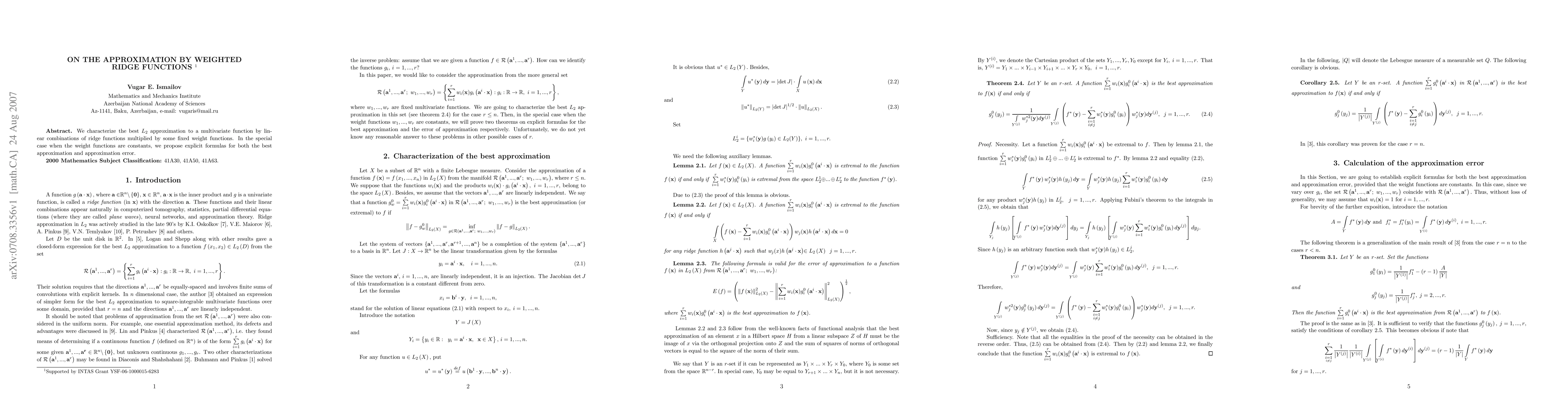We characterize the best $L_{2}$ approximation to a multivariate function by linear combinations of ridge functions multiplied by some fixed weight functions. In the special case when the weight functions are constants, we propose explicit formulas for both the best approximation and approximation error.