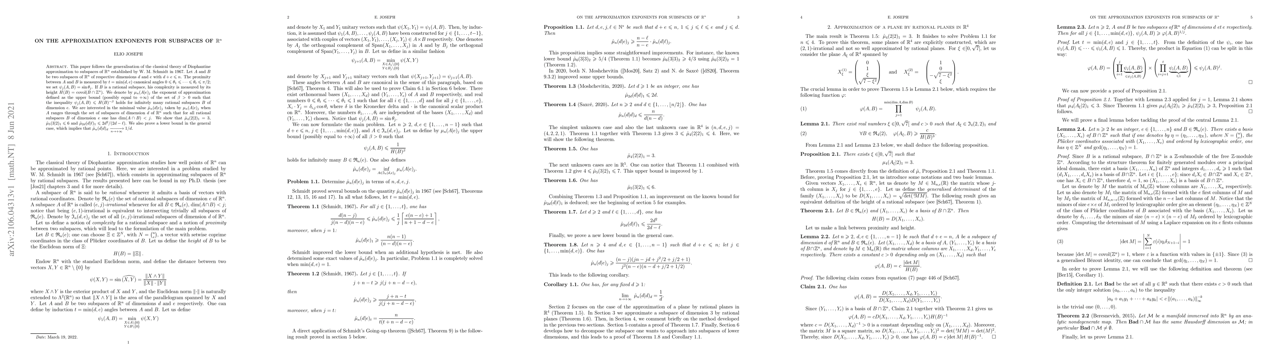 This paper generalizes Diophantine approximation theory to subspaces of $\mathbb{R}^n$, examining the minimal approximation exponents $\mathring{\mu}_n(d\vert e)_j$ for subspaces $A$ and $B$. It finds specific values for $\mathring{\mu}_n(d\vert e)_j$ and proves that $\mathring{\mu}_n(d\vert d)_d \to 1/d$ as $n \to \infty$.