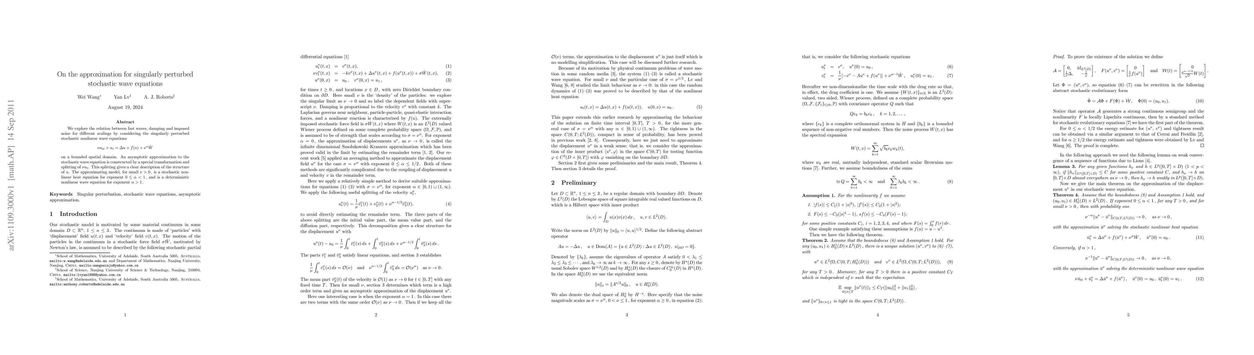 We explore the relation between fast waves, damping and imposed noise for different scalings by considering the singularly perturbed stochastic nonlinear wave equations \nu u_{tt}+u_t=\D u+f(u)+\nu^\alpha\dot{W} on a bounded spatial domain. An asymptotic approximation to the stochastic wave equation is constructed by a special transformation and splitting of $\nu u_{t}$. This splitting gives a clear description of the structure of $u$. The approximating model, for small $\nu>0$\,, is a stochastic nonlinear heat equation for exponent $0\leq\alpha<1$\,, and is a deterministic nonlinear wave equation for exponent $\alpha>1$\,.