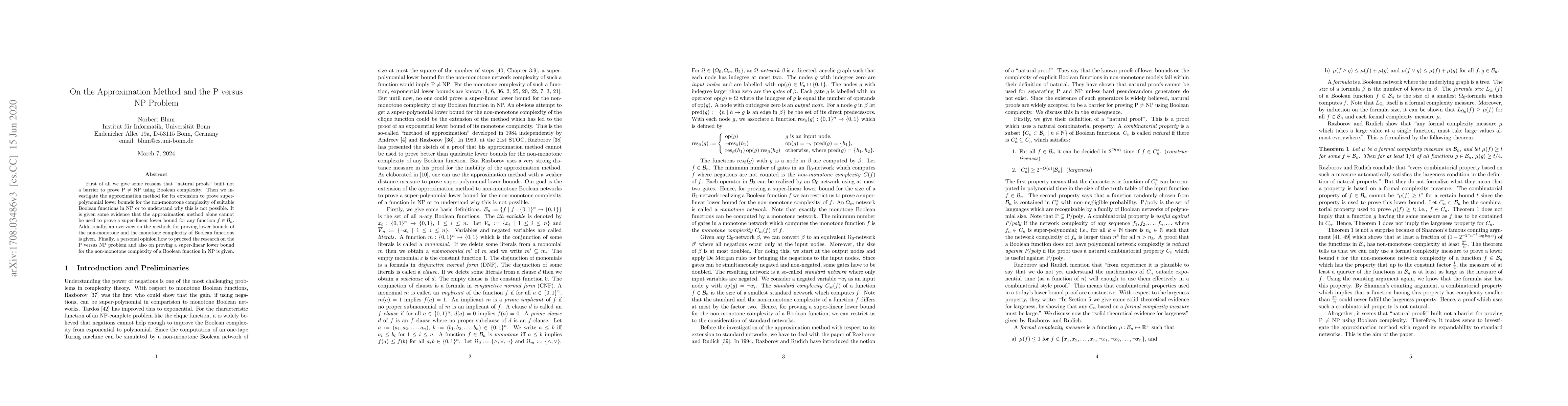 First of all we give some reasons that "natural proofs" built not a barrier to prove P $\not=$ NP using Boolean complexity. Then we investigate the approximation method for its extension to prove super-polynomial lower bounds for the non-monotone complexity of suitable Boolean functions in NP or to understand why this is not possible. It is given some evidence that the approximation method alone cannot be used to prove a super-linear lower bound for any function $f \in {\cal B}_n$. Additionally, an overview on the methods for proving lower bounds of the non-monotone and the monotone complexity of Boolean functions is given. Finally, a personal opinion how to proceed the research on the P versus NP problem and also on proving a super-linear lower bound for the non-monotone complexity of a Boolean function in NP is given.