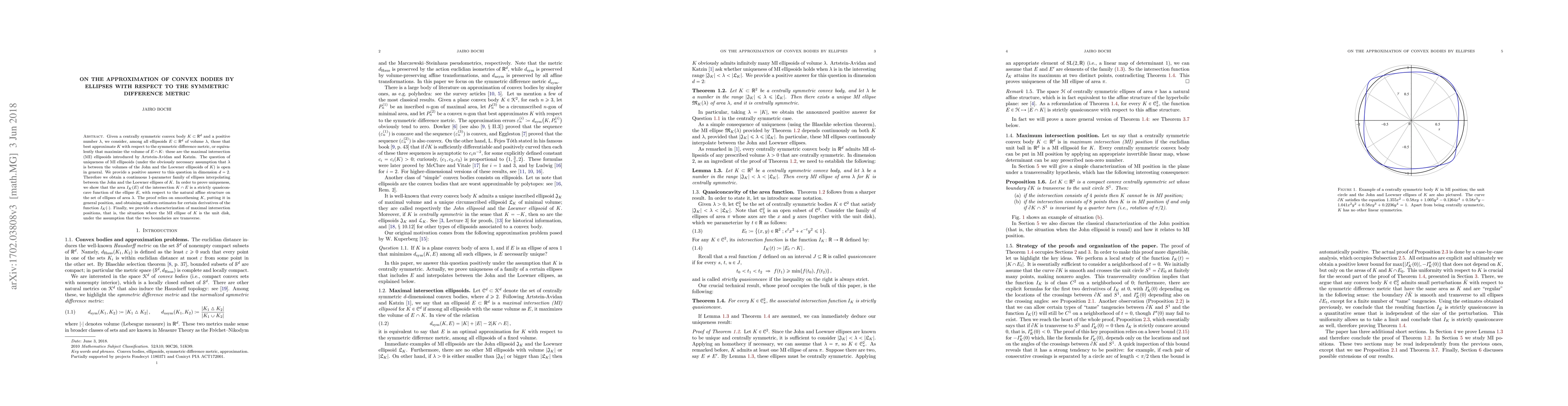 Given a centrally symmetric convex body $K \subset \mathbb{R}^d$ and a positive number $\lambda$, we consider, among all ellipsoids $E \subset \mathbb{R}^d$ of volume $\lambda$, those that best approximate $K$ with respect to the symmetric difference metric, or equivalently that maximize the volume of $E\cap K$: these are the maximal intersection (MI) ellipsoids introduced by Artstein-Avidan and Katzin. The question of uniqueness of MI ellipsoids (under the obviously necessary assumption that $\lambda$ is between the volumes of the John and the Loewner ellipsoids of $K$) is open in general. We provide a positive answer to this question in dimension $d=2$. Therefore we obtain a continuous $1$-parameter family of ellipses interpolating between the John and the Loewner ellipses of $K$. In order to prove uniqueness, we show that the area $I_K(E)$ of the intersection $K \cap E$ is a strictly quasiconcave function of the ellipse $E$, with respect to the natural affine structure on the set of ellipses of area $\lambda$. The proof relies on smoothening $K$, putting it in general position, and obtaining uniform estimates for certain derivatives of the function $I_K(.)$. Finally, we provide a characterization of maximal intersection positions, that is, the situation where the MI ellipse of $K$ is the unit disk, under the assumption that the two boundaries are transverse.