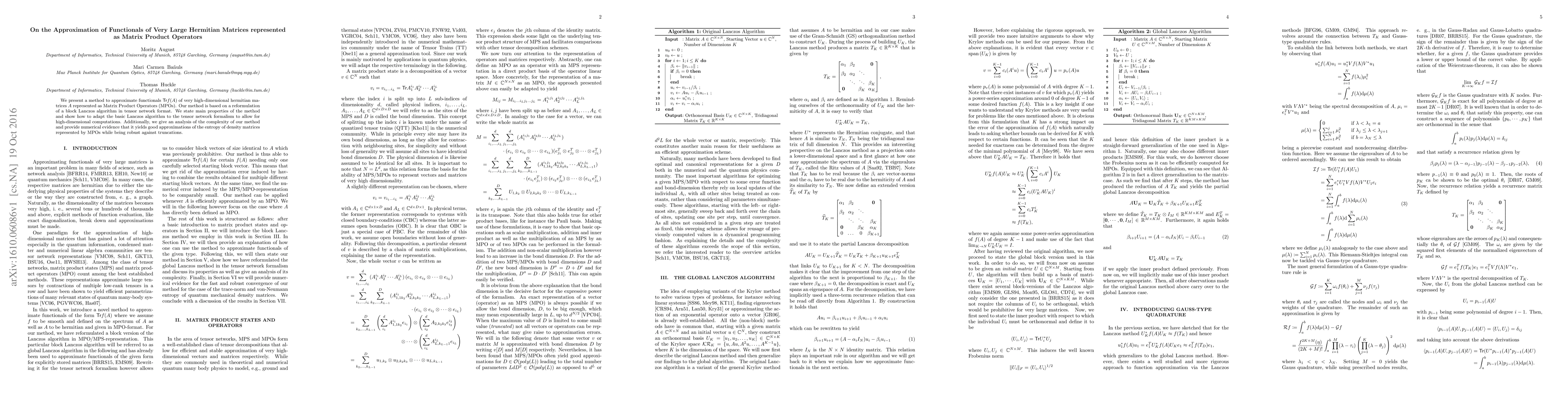 We present a method to approximate functionals $\text{Tr} \, f(A)$ of very high-dimensional hermitian matrices $A$ represented as Matrix Product Operators (MPOs). Our method is based on a reformulation of a block Lanczos algorithm in tensor network format. We state main properties of the method and show how to adapt the basic Lanczos algorithm to the tensor network formalism to allow for high-dimensional computations. Additionally, we give an analysis of the complexity of our method and provide numerical evidence that it yields good approximations of the entropy of density matrices represented by MPOs while being robust against truncations.