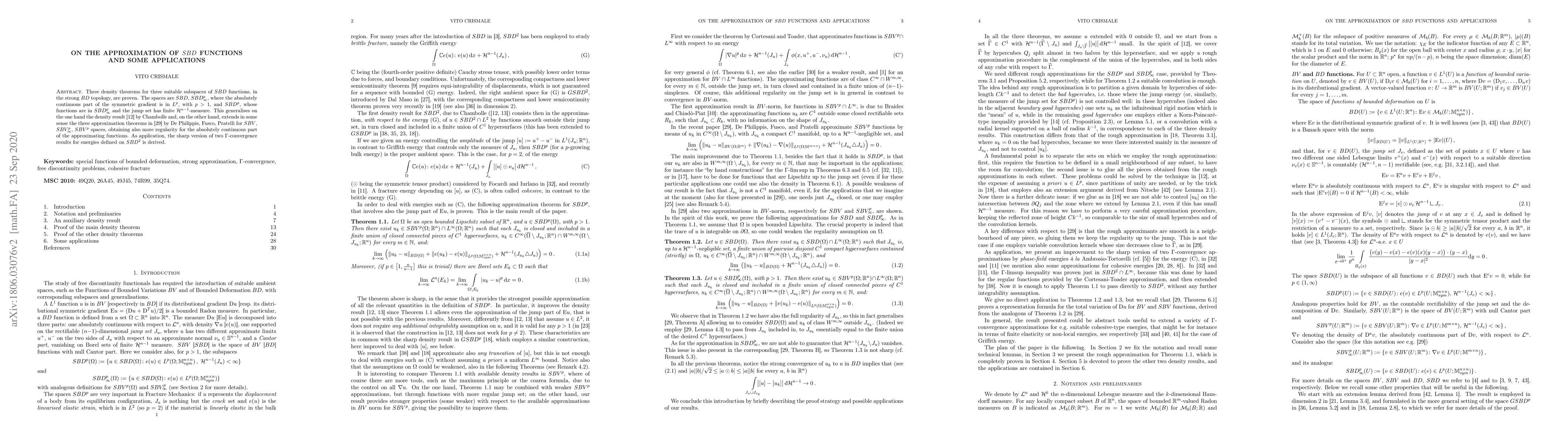 Three density theorems for three suitable subspaces of $SBD$ functions, in the strong $BD$ topology, are proven. The spaces are $SBD$, $SBD^p_\infty$, where the absolutely continuous part of the symmetric gradient is in $L^p$, with $p>1$, and $SBD^p$, whose functions are in $SBD^p_\infty$ and the jump set has finite $\mathcal{H}^{n-1}$-measure. This generalises on the one hand the density result by [Chambolle, 2004-2005] and, on the other hand, extends in some sense the three approximation theorems in by [De Philippis, Fusco, Pratelli, 2017] for $SBV$, $SBV^p_\infty$, $SBV^p$ spaces, obtaining also more regularity for the absolutely continuous part of the approximating functions. As application, the sharp version of two $\Gamma$-convergence results for energies defined on $SBD^2$ is derived.