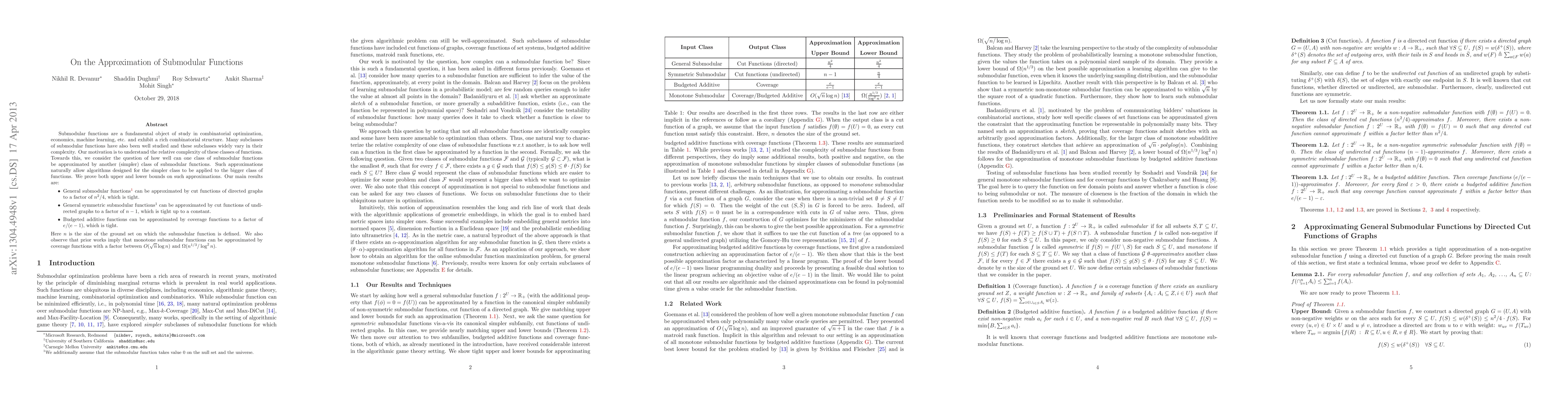 This paper explores the approximation of various classes of submodular functions by simpler classes, proving both upper and lower bounds. Key results include approximating general submodular functions by cut functions of directed graphs to a factor of $n^2/4$, symmetric submodular functions by cut functions of undirected graphs to a factor of $n-1$, and budgeted additive functions by coverage functions to a factor of $e/(e-1)$.