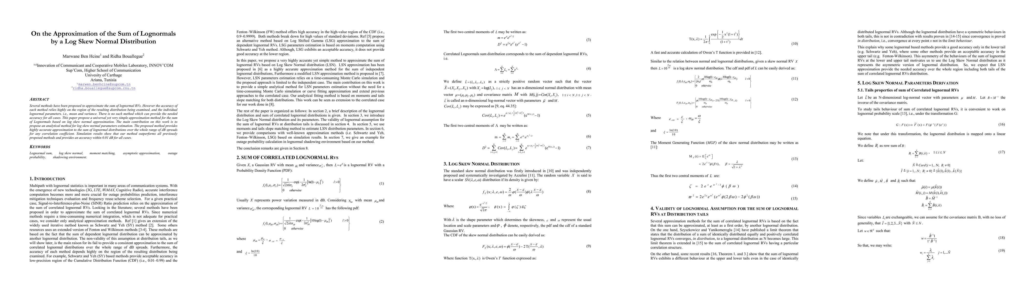 This paper proposes a new method to approximate the sum of lognormal random variables using a log skew normal distribution. The key contribution is an analytical approach for estimating log skew normal parameters, which provides highly accurate approximations across various dB spreads and correlation coefficients, outperforming previous methods.