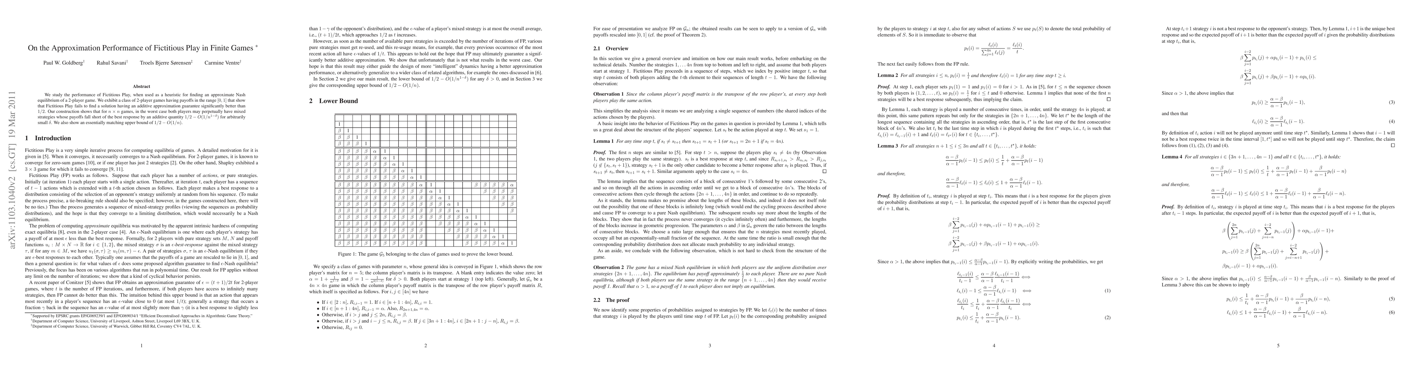 This paper investigates the approximation performance of Fictitious Play in 2-player games, revealing that it fails to achieve an additive approximation guarantee significantly better than 1/2. It constructs specific n-by-n games where both players perpetually fall short of the best response by an additive quantity of 1/2 - O(1/n^(1-delta)), demonstrating a worst-case scenario.