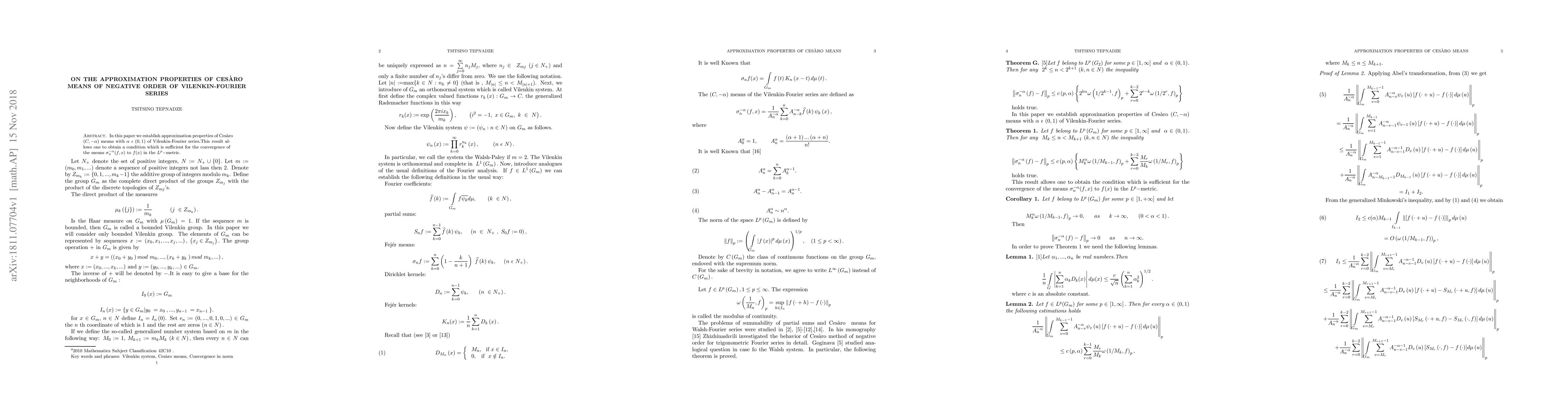 In this paper we establish approximation properties of Ces\`{a}ro $(C,-\alpha )$ means with $\alpha$ $\epsilon$ $(0,1)$ of Vilenkin-Fourier series.This result allows one to obtain a condition which is sufficient for the convergence of the means $\sigma_n^{-\alpha }(f,x)$ to $f(x)$ in the $L^p-$metric.