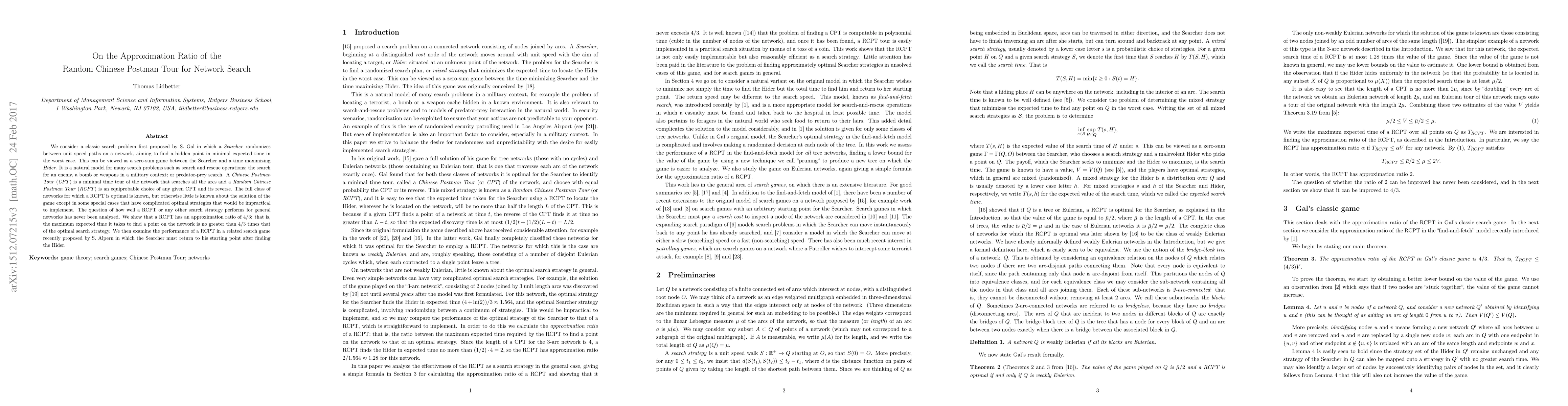 A study found that a Random Chinese Postman Tour has an approximation ratio of $4/3$, meaning it can find a point in a network within $4/3$ times the optimal time, and its performance was analyzed in a related search game.