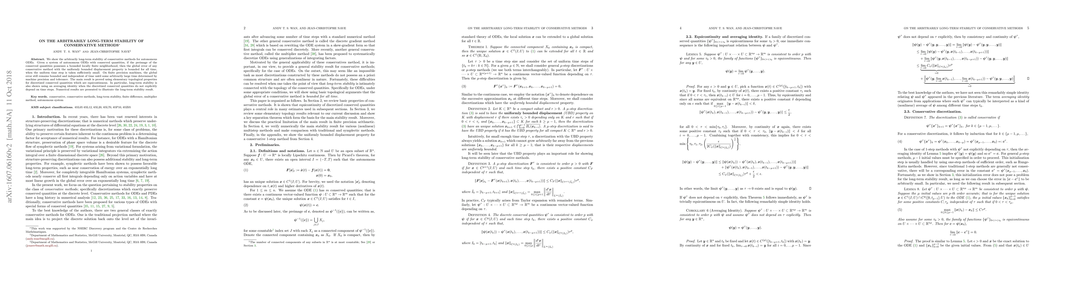 We show the arbitrarily long-term stability of conservative methods for autonomous ODEs. Given a system of autonomous ODEs with conserved quantities, if the preimage of the conserved quantities possesses a bounded locally nite neighborhood, then the global error of any conservative method with the uniformly bounded displacement property is bounded for all time, when the uniform time step is taken suciently small. On nite precision machines, the global error still remains bounded and independent of time until some arbitrarily large time determined by machine precision and tolerance. The main result is proved using elementary topological properties for discretized conserved quantities which are equicontinuous. In particular, long-term stability is also shown using an averaging identity when the discretized conserved quantities do not explicitly depend on time steps. Numerical results are presented to illustrate the long-term stability result.