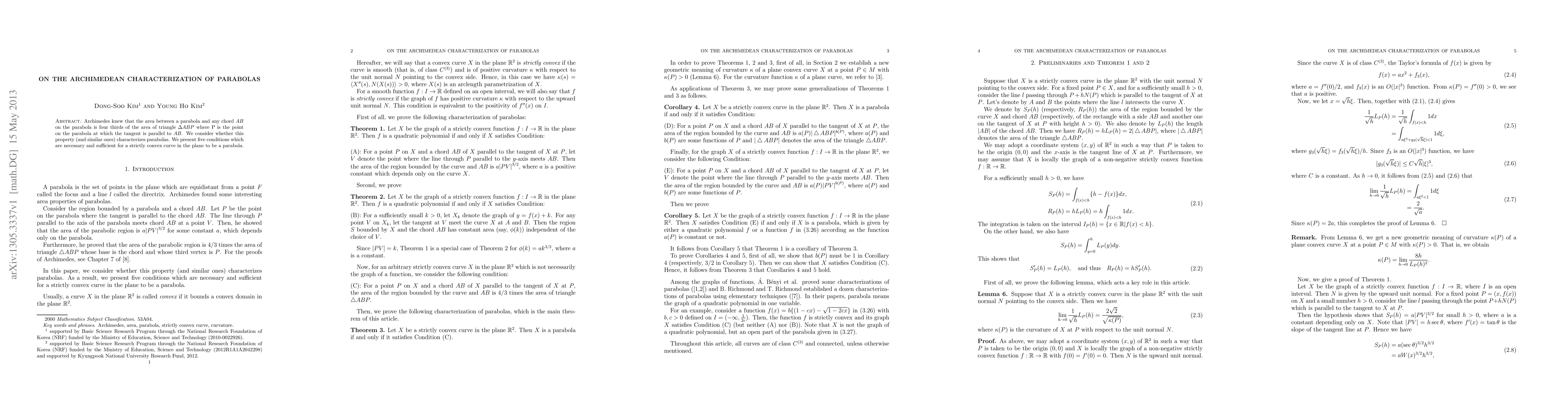 This paper explores whether Archimedes' property uniquely identifies parabolas, presenting five necessary and sufficient conditions for a strictly convex curve to be a parabola. It concludes that these conditions indeed characterize parabolas.