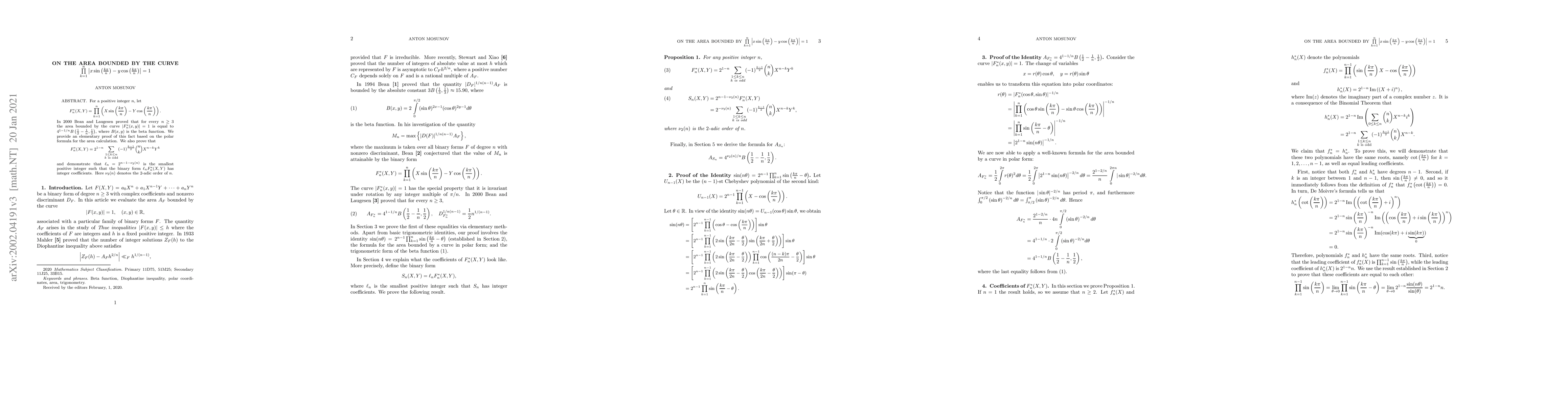 This paper provides an elementary proof for the area bounded by the curve defined by $|F_n^*(x, y)| = 1$, showing it equals $4^{1 - 1/n}B\left(\frac{1}{2} - \frac{1}{n}, \frac{1}{2}\right)$. It also establishes a formula for $F_n^*(X, Y)$ and determines the smallest integer $\ell_n$ ensuring $F_n^*(X, Y)$ has integer coefficients when multiplied by $\ell_n$.