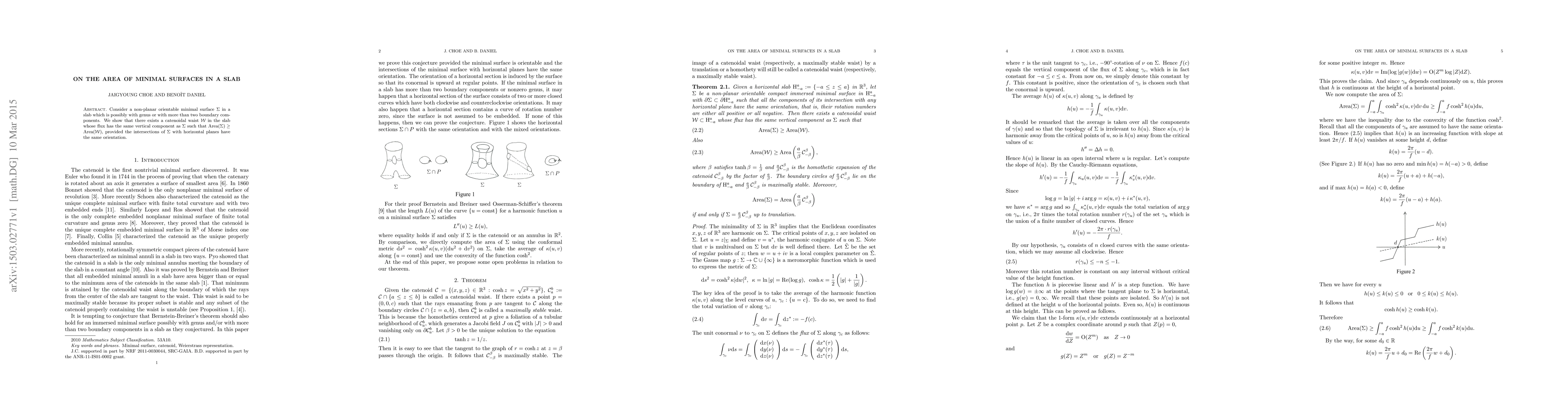 Consider a non-planar orientable minimal surface S in a slab which is possibly with genus or with more than two boundary components. We show that there exists a catenoidal waist W in the slab whose flux has the same vertical component as S such that Area(S)>= Area(W), provided the intersections of S with horizontal planes have the same orientation.