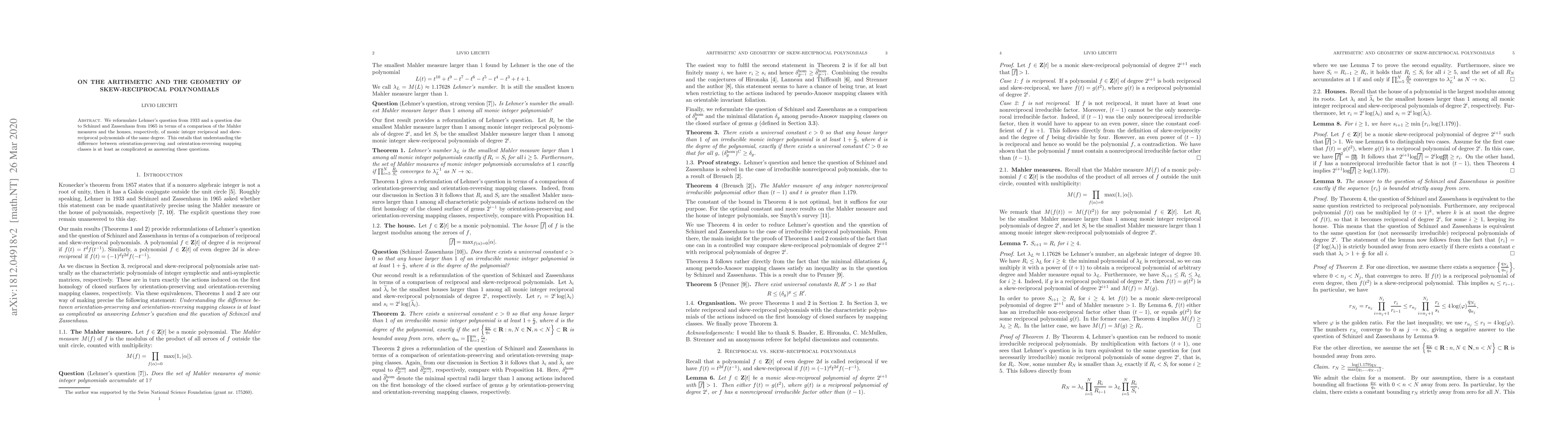 We reformulate Lehmer's question from 1933 and a question due to Schinzel and Zassenhaus from 1965 in terms of a comparison of the Mahler measures and the houses, respectively, of monic integer reciprocal and skew-reciprocal polynomials of the same degree. This entails that understanding the difference between orientation-preserving and orientation-reversing mapping classes is at least as complicated as answering these questions.