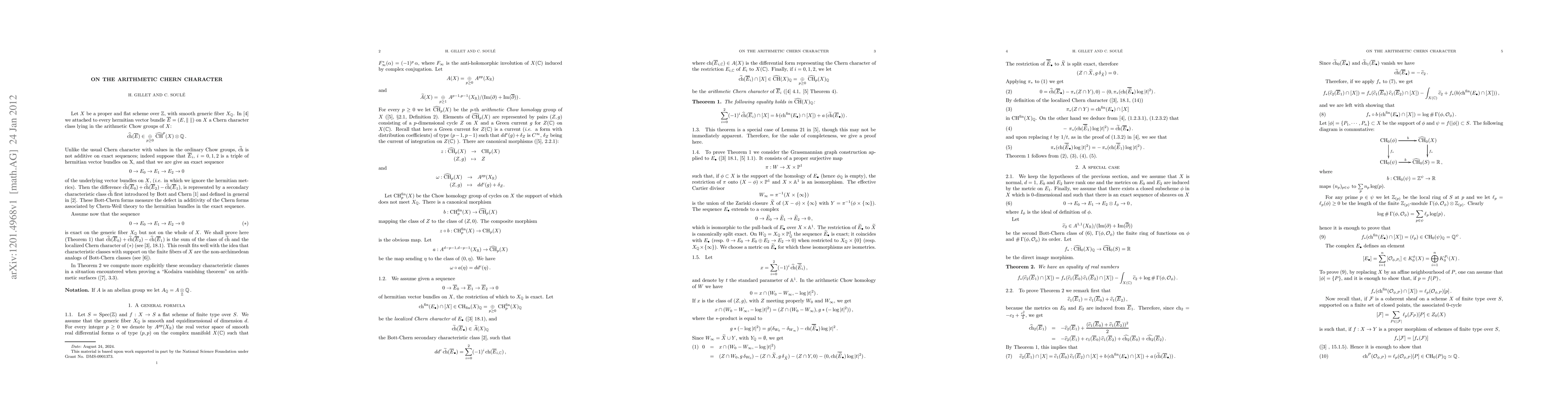 This paper proves that the alternated sum of arithmetic Chern characters for a short exact sequence of hermitian vector bundles on an arithmetic variety can be decomposed into the secondary Bott Chern character class and the Chern character supported on finite fibers. The authors compute these classes in the context of a "Kodaira vanishing theorem" for arithmetic surfaces.