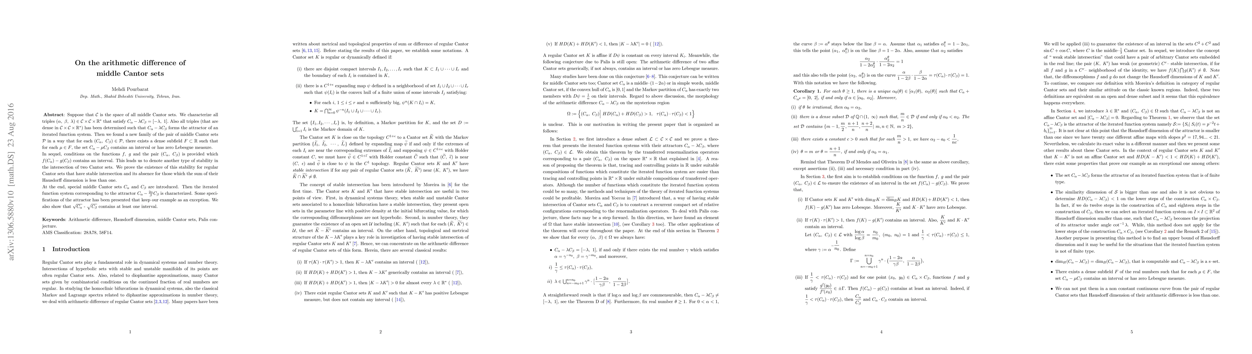 This paper characterizes arithmetic differences between middle Cantor sets, identifying triples that satisfy specific difference conditions and determining when such differences form attractors of iterated function systems. It introduces a new family of Cantor set pairs where differences contain intervals or have zero Lebesgue measure, and proves stability conditions for regular Cantor sets with stable intersections.