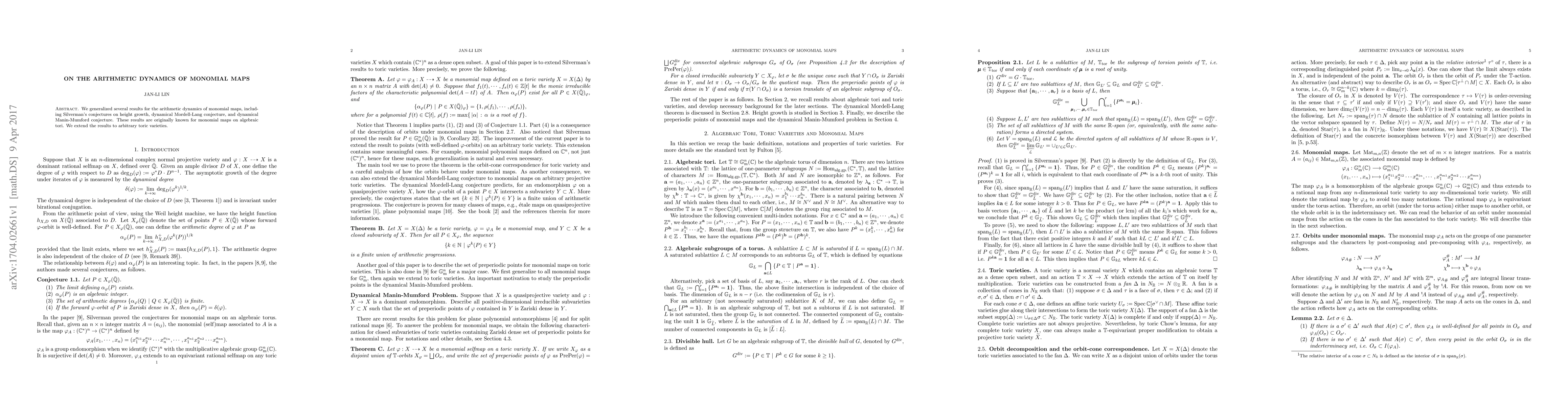 This paper generalizes findings in arithmetic dynamics for monomial maps, extending Silverman's conjectures, the dynamical Mordell-Lang conjecture, and the dynamical Manin-Mumford conjecture from algebraic tori to arbitrary toric varieties.