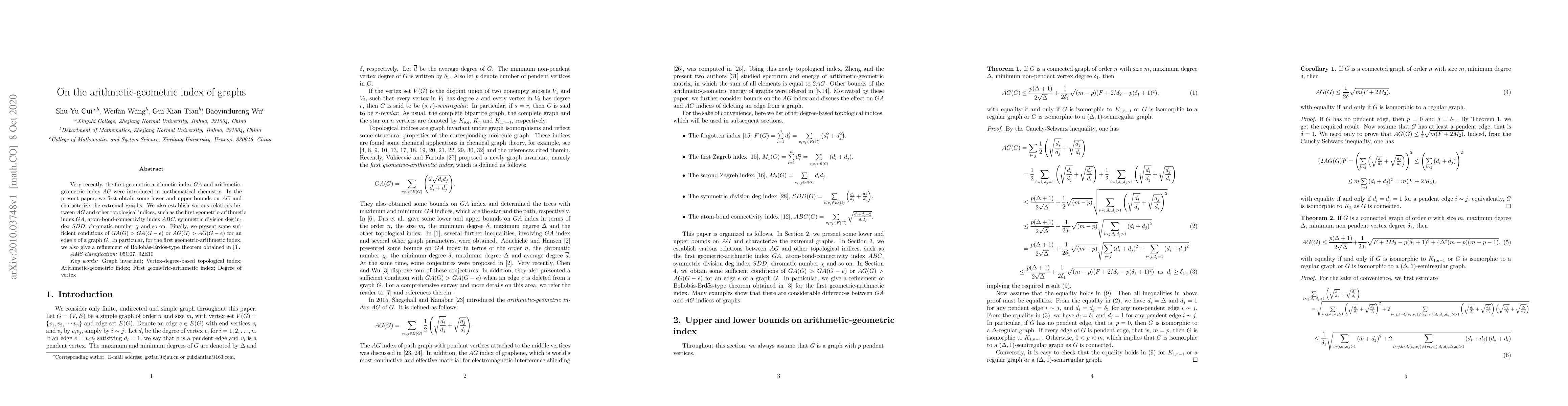 Very recently, the first geometric-arithmetic index $GA$ and arithmetic-geometric index $AG$ were introduced in mathematical chemistry. In the present paper, we first obtain some lower and upper bounds on $AG$ and characterize the extremal graphs. We also establish various relations between $AG$ and other topological indices, such as the first geometric-arithmetic index $GA$, atom-bond-connectivity index $ABC$, symmetric division deg index $SDD$, chromatic number $\chi$ and so on. Finally, we present some sufficient conditions of $GA(G)>GA(G-e)$ or $AG(G)>AG(G-e)$ for an edge $e$ of a graph $G$. In particular, for the first geometric-arithmetic index, we also give a refinement of Bollob\'{a}s-Erd\H{o}s-type theorem obtained in [3].