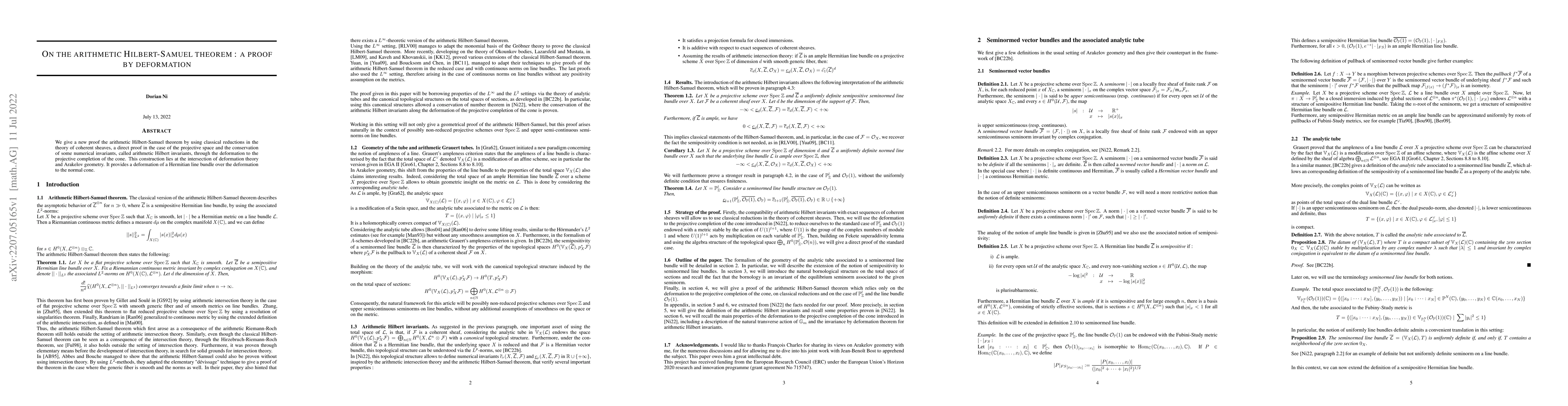 We give a new proof the arithmetic Hilbert-Samuel theorem by using classical reductions in the theory of coherent sheaves, a direct proof in the case of the projective space and the conservation of some numerical invariants, called arithmetic Hilbert invariants, through the deformation to the projective completion of the cone. This construction lies at the intersection of deformation theory and Arakelov geometry. It provides a deformation of a Hermitian line bundle over the deformation to the normal cone.