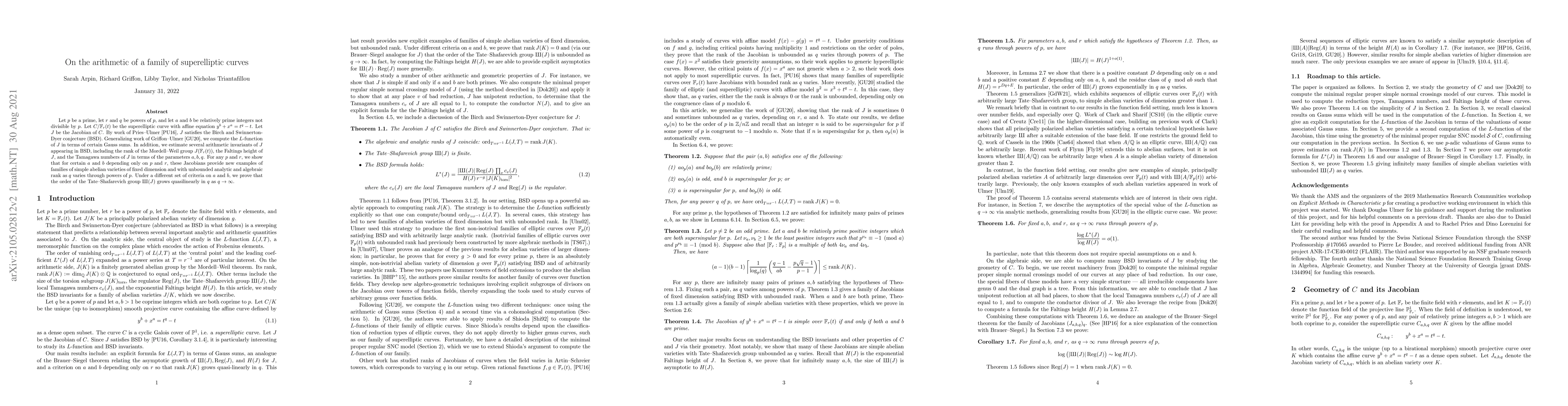 Let $p$ be a prime, let $r$ and $q$ be powers of $p$, and let $a$ and $b$ be relatively prime integers not divisible by $p$. Let $C/\mathbb F_{r}(t)$ be the superelliptic curve with affine equation $y^b+x^a=t^q-t$. Let $J$ be the Jacobian of $C$. By work of Pries--Ulmer, $J$ satisfies the Birch and Swinnerton-Dyer conjecture (BSD). Generalizing work of Griffon--Ulmer, we compute the $L$-function of $J$ in terms of certain Gauss sums. In addition, we estimate several arithmetic invariants of $J$ appearing in BSD, including the rank of the Mordell--Weil group $J(\mathbb F_{r}(t))$, the Faltings height of $J$, and the Tamagawa numbers of $J$ in terms of the parameters $a,b,q$. For any $p$ and $r$, we show that for certain $a$ and $b$ depending only on $p$ and $r$, these Jacobians provide new examples of families of simple abelian varieties of fixed dimension and with unbounded analytic and algebraic rank as $q$ varies through powers of $p$. Under a different set of criteria on $a$ and $b$, we prove that the order of the Tate--Shafarevich group of $J$ grows quasilinearly in $q$ as $q \to \infty.$