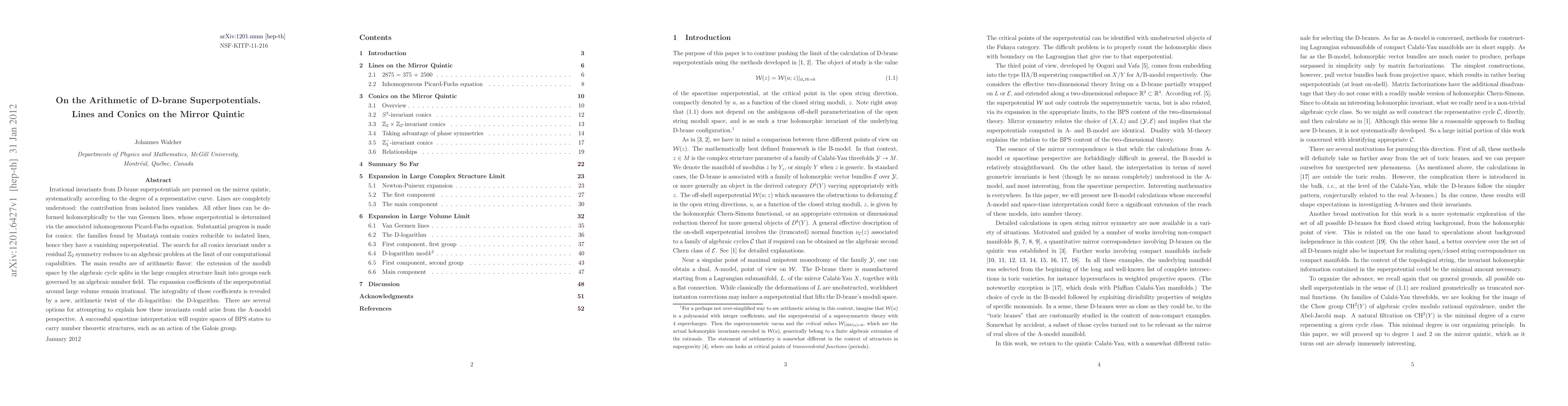 Irrational invariants from D-brane superpotentials are pursued on the mirror quintic, systematically according to the degree of a representative curve. Lines are completely understood: the contribution from isolated lines vanishes. All other lines can be deformed holomorphically to the van Geemen lines, whose superpotential is determined via the associated inhomogeneous Picard-Fuchs equation. Substantial progress is made for conics: the families found by Mustata contain conics reducible to isolated lines, hence they have a vanishing superpotential. The search for all conics invariant under a residual Z2 symmetry reduces to an algebraic problem at the limit of our computational capabilities. The main results are of arithmetic flavor: the extension of the moduli space by the algebraic cycle splits in the large complex structure limit into groups each governed by an algebraic number field. The expansion coefficients of the superpotential around large volume remain irrational. The integrality of those coefficients is revealed by a new, arithmetic twist of the di-logarithm: the D-logarithm. There are several options for attempting to explain how these invariants could arise from the A-model perspective. A successful spacetime interpretation will require spaces of BPS states to carry number theoretic structures, such as an action of the Galois group.