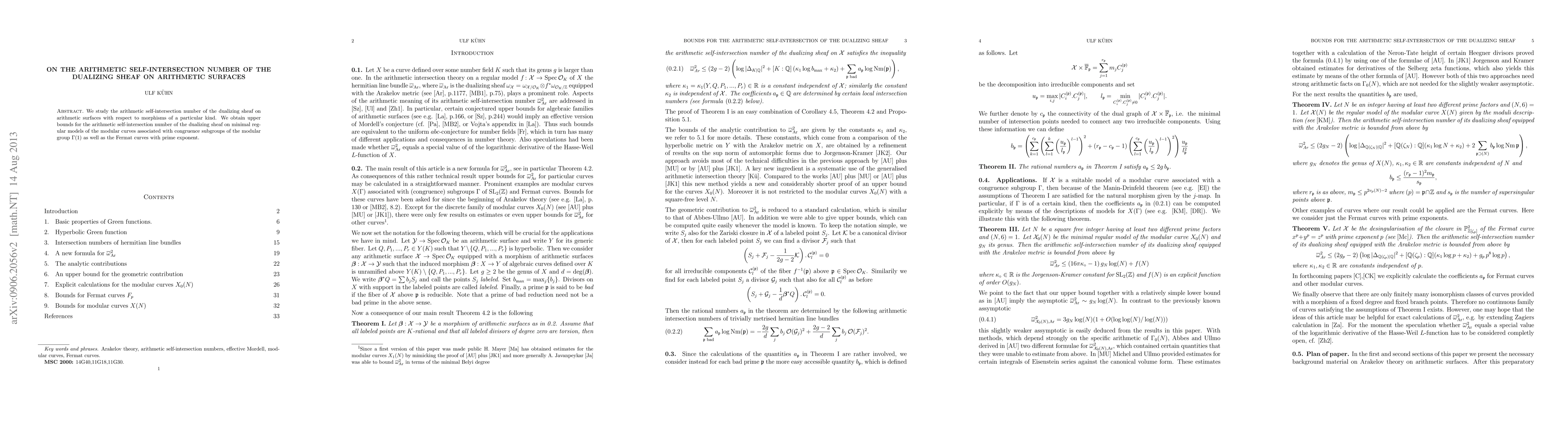 This paper investigates the arithmetic self-intersection number of the dualizing sheaf on arithmetic surfaces, deriving upper bounds for these numbers on minimal models of modular curves linked to specific congruence subgroups and for modular and Fermat curves with prime exponents.