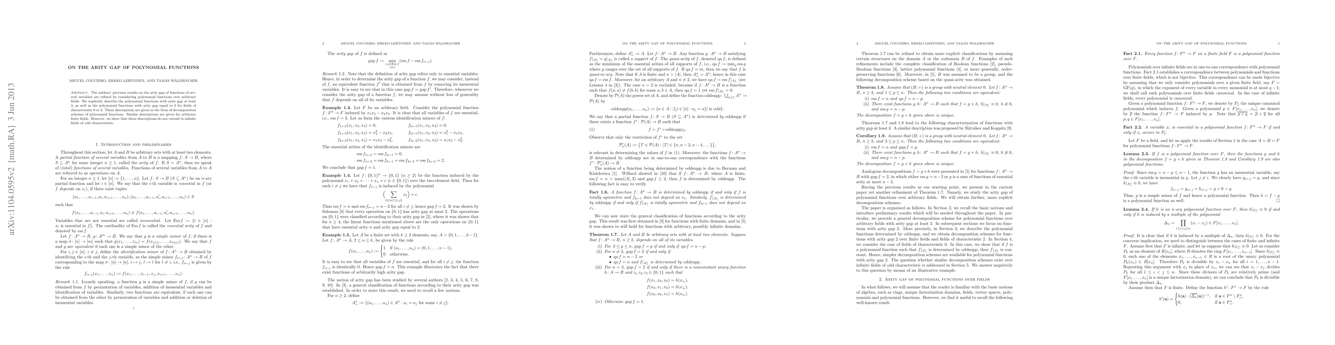 This paper refines previous results on the arity gap of polynomial functions, explicitly describing those with arity gap of at least 3 and gap equal to 2 for fields of characteristic 0 or 2, while showing that no such decomposition schemes exist for infinite fields of odd characteristic.