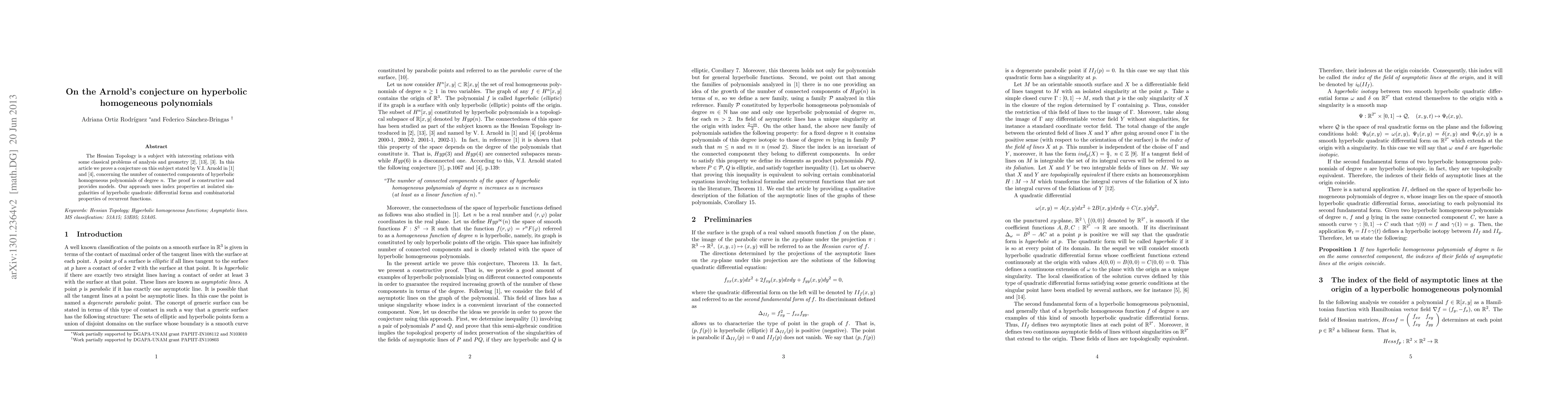 The Hessian Topology is a subject with interesting relations with some classical problems of analysis and geometry. In this article we prove a conjecture on this subject stated by V.I. Arnold concerning the number of connected components of hyperbolic homogeneous polynomials of degree $n$. The proof is constructive and provides models. Our approach uses index properties at isolated singularities of hyperbolic quadratic differential forms and combinatorial properties of recurrent functions.