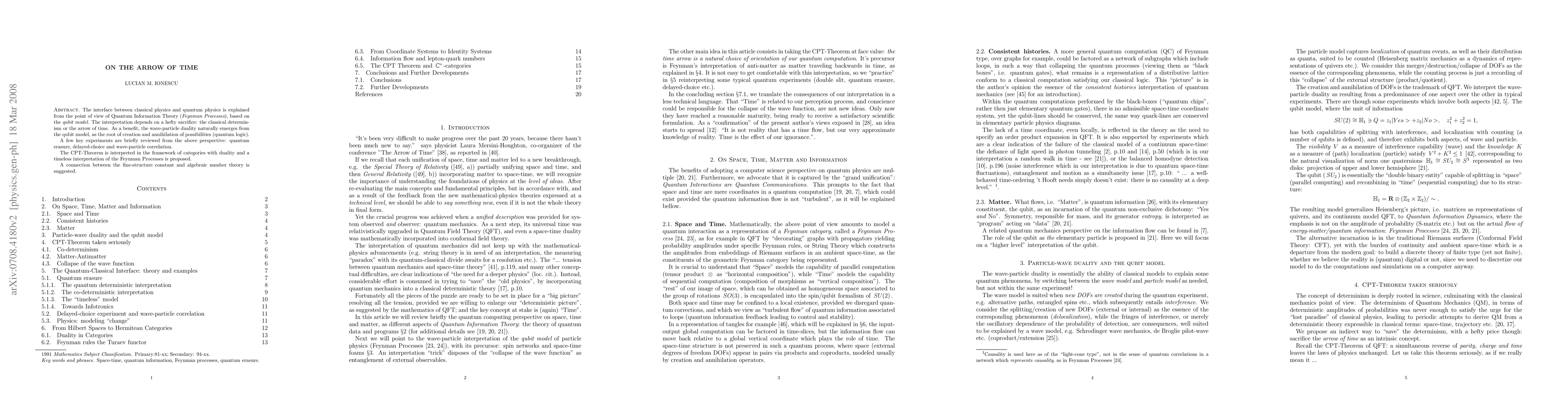 The interface between classical physics and quantum physics is explained from the point of view of quantum information theory (Feynman Processes). The interpretation depends on a hefty sacrifice: the classical determinism or the arrow of time. The wave-particle duality steams from the qubit model, as the root of creation and annihilation of possibilities. A few key experiments are briefly reviewed from the above perspective: quantum erasure, delayed-choice and wave-particle correlation. The CPT-Theorem is interpreted in the framework of categories with duality and a timeless interpretation of the Feynman Processes is proposed. A connection between the fine-structure constant and algebraic number theory is suggested.