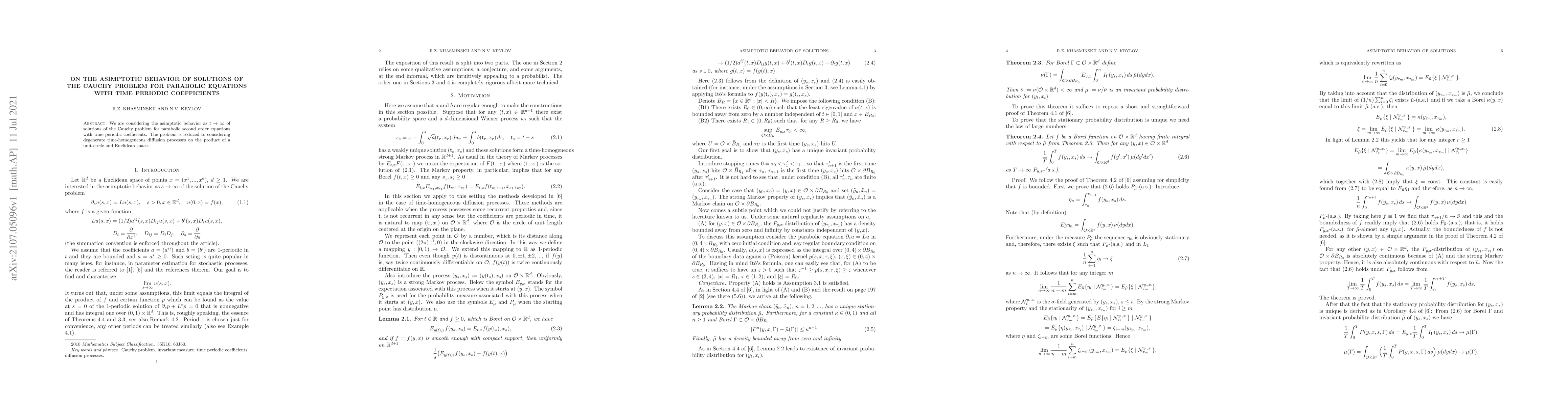 The study investigates the asymptotic behavior of solutions to parabolic equations with time-periodic coefficients as time approaches infinity. It reduces the problem to analyzing degenerate diffusion processes on a product space.