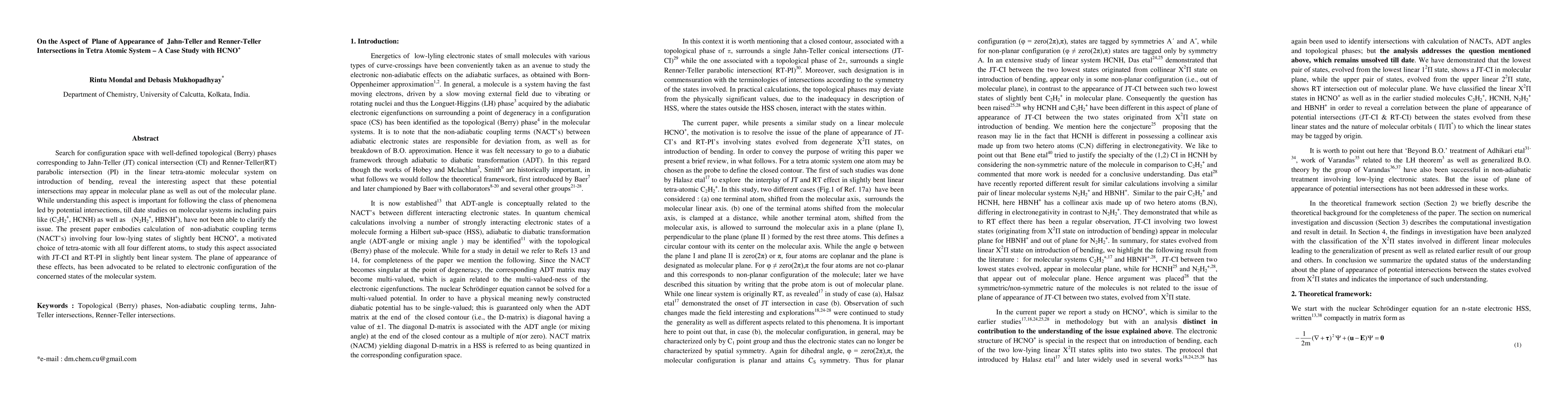 Search for configuration space with welldefined topological (Berry) phases corresponding to Jahn Teller (JT) conical intersection (CI) and Renner Teller(RT) parabolic intersection (PI) in the linear tetra-atomic molecular system on introduction of bending, reveal the interesting aspect that these potential intersections may appear in molecular plane as well as out of the molecular plane. While understanding this aspect is important for following the class of phenomena led by potential intersections, till date studies on molecular systems including pairs like (C2H2plus , HCNH) as well as (N2H2plus , HBNHplus ), have not been able to clarify the issue. The present paper embodies calculation of non-adiabatic coupling terms (NACTs) involving four low lying states of slightly bent HCNOplus , a motivated choice of tetra-atomic with all four different atoms, to study this aspect associated with JTCI and RTPI in slightly bent linear system. The plane of appearance of these effects, has been advocated to be related to electronic configuration of the concerned states of the molecular system.