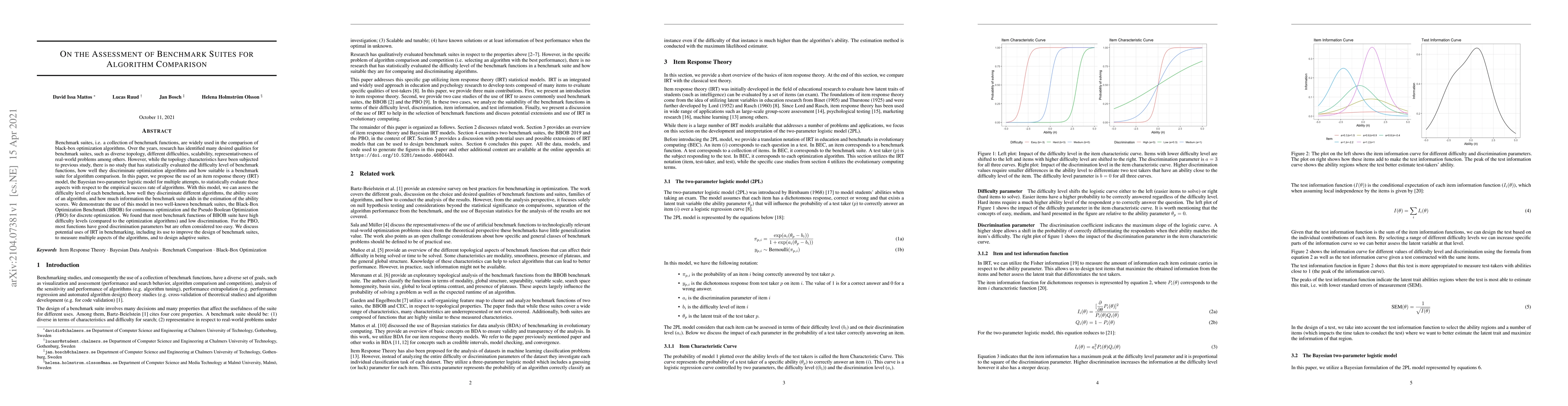 This paper proposes the use of an item response theory (IRT) model to statistically evaluate benchmark suites for optimizing algorithm comparison. The study finds that most BBOB benchmarks are too difficult, while PBO benchmarks are too easy, suggesting room for improvement in benchmark design.