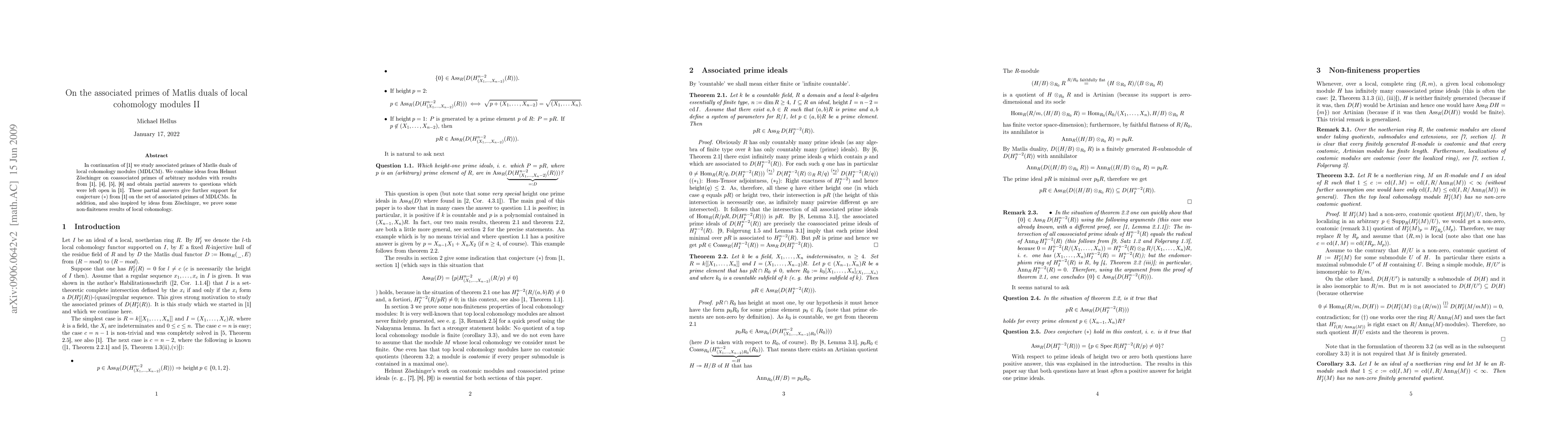 This paper continues the study of associated primes of Matlis duals of local cohomology modules (MDLCM), building on prior work and combining insights from Helmut Zöschinger’s theories. It provides partial answers to unresolved questions, supporting conjecture (*) on the associated primes of MDLCMs and proves some non-finiteness results for local cohomology.