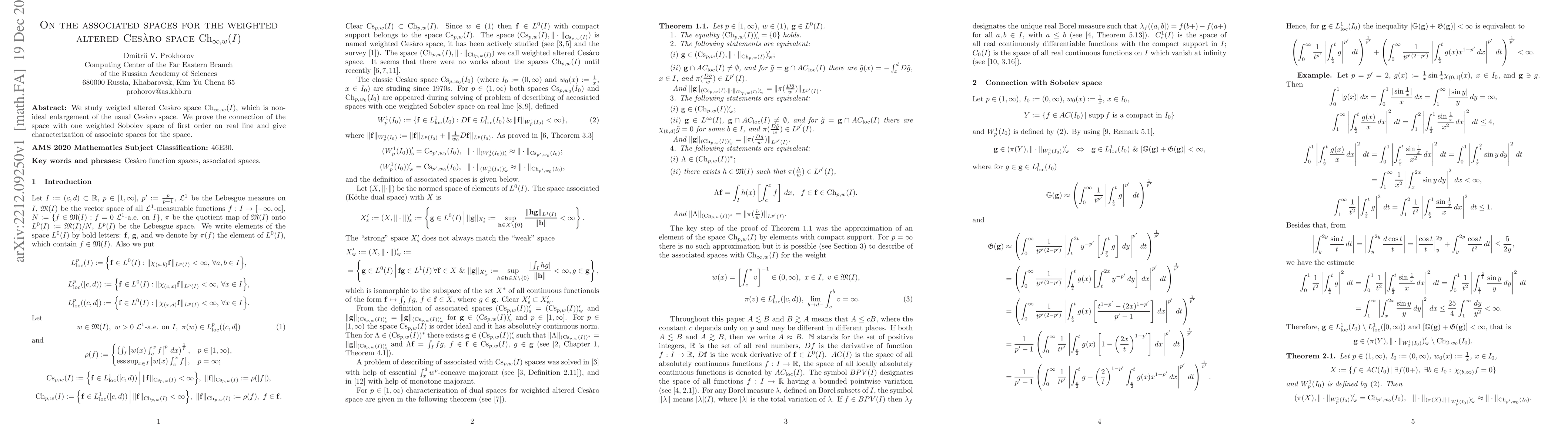 We study weigted altered Ces\`aro space Ch$_{\infty,w}(I)$, which is non-ideal enlargement of the usual Ces\`aro space. We prove the connection of the space with one weighted Sobolev space of first order on real line and give characterization of associate spaces for the space.