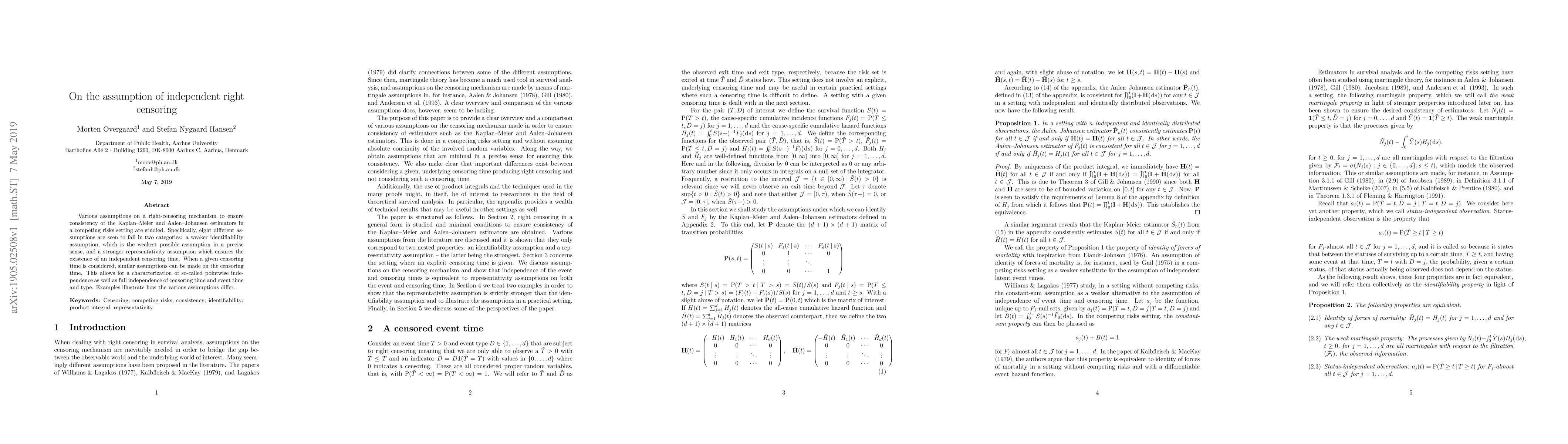 Various assumptions on a right-censoring mechanism to ensure consistency of the Kaplan--Meier and Aalen--Johansen estimators in a competing risks setting are studied. Specifically, eight different assumptions are seen to fall in two categories: a weaker identifiability assumption, which is the weakest possible assumption in a precise sense, and a stronger representativity assumption which ensures the existence of an independent censoring time. When a given censoring time is considered, similar assumptions can be made on the censoring time. This allows for a characterization of so-called pointwise independence as well as full independence of censoring time and event time and type. Examples illustrate how the various assumptions differ.