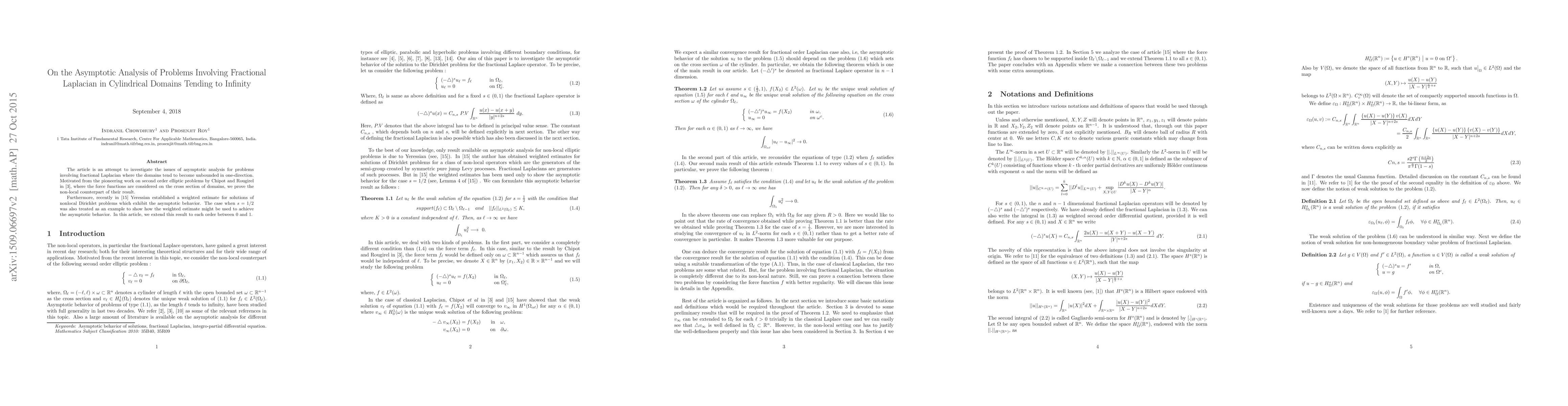 The article is an attempt to investigate the issues of asymptotic analysis for problems involving fractional Laplacian where the domains tend to become unbounded in one-direction. Motivated from the pioneering work on second order elliptic problems by Chipot and Rougirel, where the force functions are considered on the cross section of domains, we prove the non-local counterpart of their result. Furthermore, recently Yeressian established a weighted estimate for solutions of nonlocal Dirichlet problems which exhibit the asymptotic behavior. The case whens= 1=2 was also treated as an example to show how the weighted estimate might be used to achieve the asymptotic behavior. In this article, we extend this result to each order between 0 and 1.
