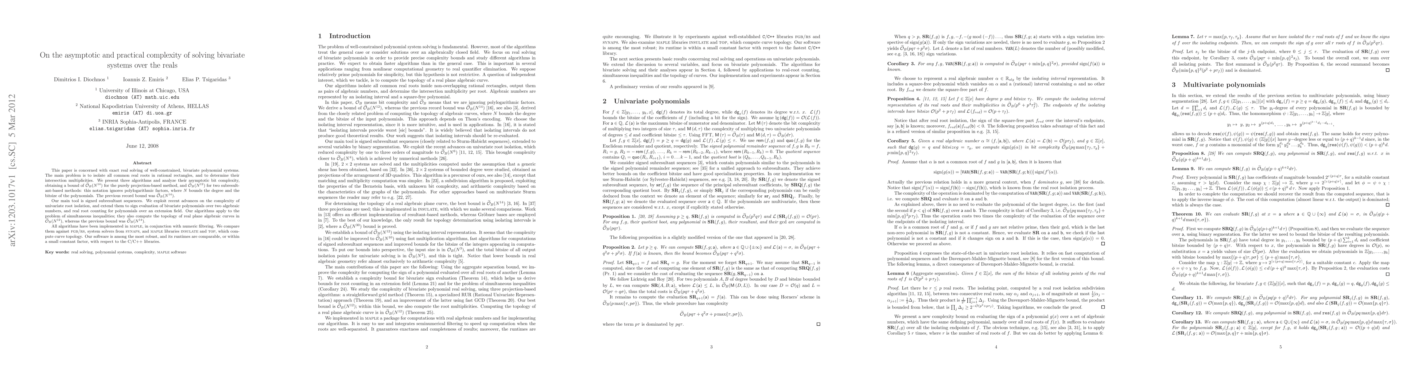 Researchers have developed three algorithms for solving bivariate polynomial systems over the reals, achieving asymptotic bounds of $\sOB(N^{12})$ for two subresultant-based methods, improving upon a previous record bound of $\sOB(N^{14})$.
