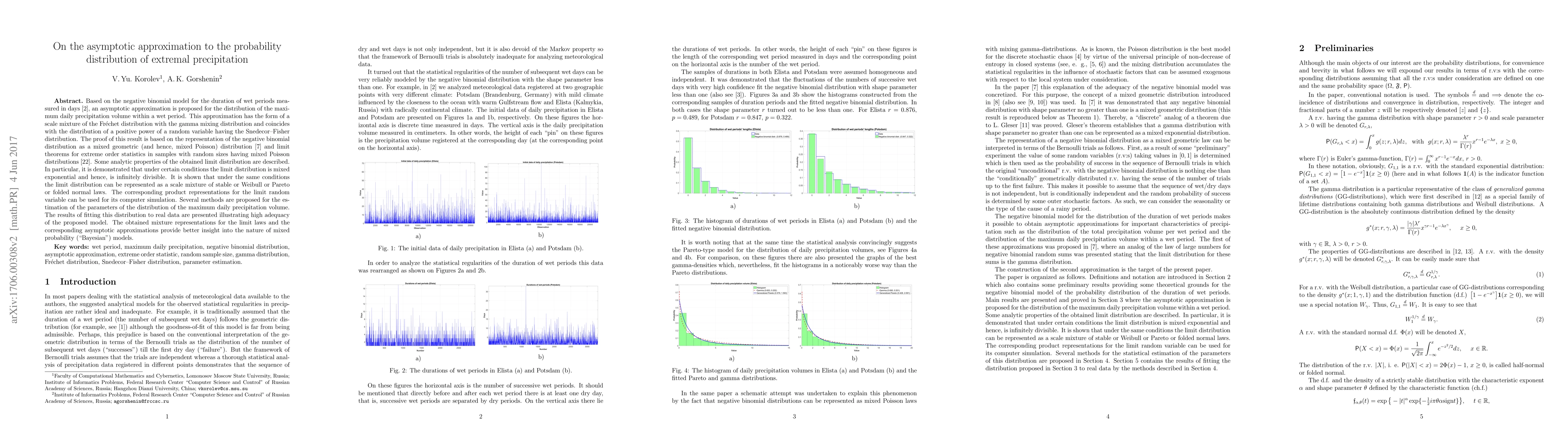Based on the negative binomial model for the duration of wet periods measured in days, an asymptotic approximation is proposed for the distribution of the maximum daily precipitation volume within a wet period. This approximation has the form of a scale mixture of the Frechet distribution with the gamma mixing distribution and coincides with the distribution of a positive power of a random variable having the Snedecor-Fisher distribution. The proof of this result is based on the representation of the negative binomial distribution as a mixed geometric (and hence, mixed Poisson) distribution and limit theorems for extreme order statistics in samples with random sizes having mixed Poisson distributions. Some analytic properties of the obtained limit distribution are described. In particular, it is demonstrated that under certain conditions the limit distribution is mixed exponential and hence, is infinitely divisible. It is shown that under the same conditions the limit distribution can be represented as a scale mixture of stable or Weibull or Pareto or folded normal laws. The corresponding product representations for the limit random variable can be used for its computer simulation. Several methods are proposed for the estimation of the parameters of the distribution of the maximum daily precipitation volume. The results of fitting this distribution to real data are presented illustrating high adequacy of the proposed model. The obtained mixture representations for the limit laws and the corresponding asymptotic approximations provide better insight into the nature of mixed probability ("Bayesian") models.