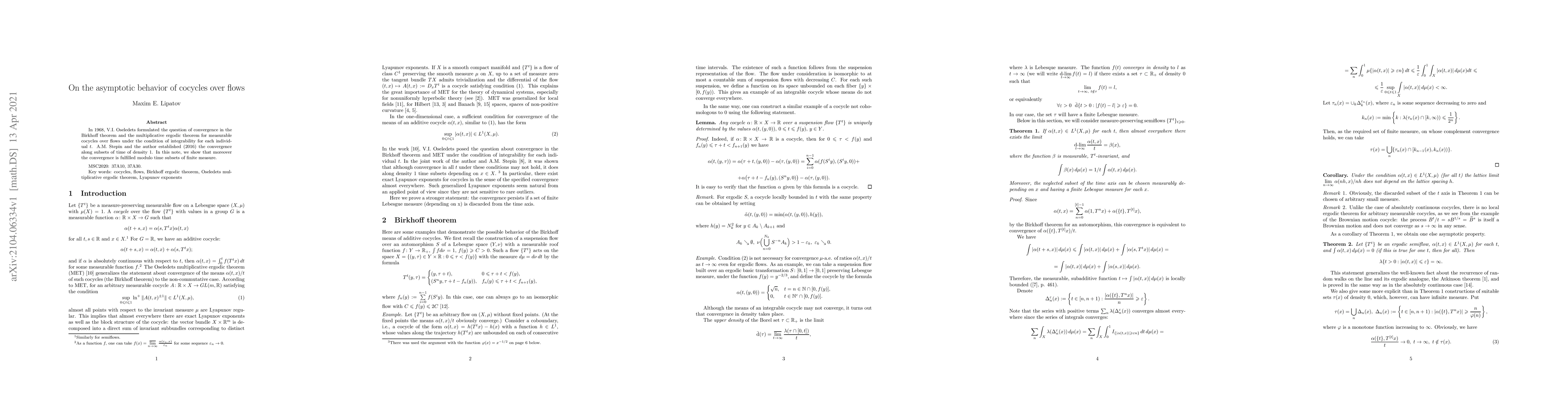 In 1968, V.I. Oseledets formulated the question of convergence in the Birkhoff theorem and the multiplicative ergodic theorem for measurable cocycles over flows under the condition of integrability for each individual t. A.M. Stepin and the author established (2016) the convergence along subsets of time of density 1. In this note, we show that moreover the convergence is fulfilled modulo time subsets of finite measure.