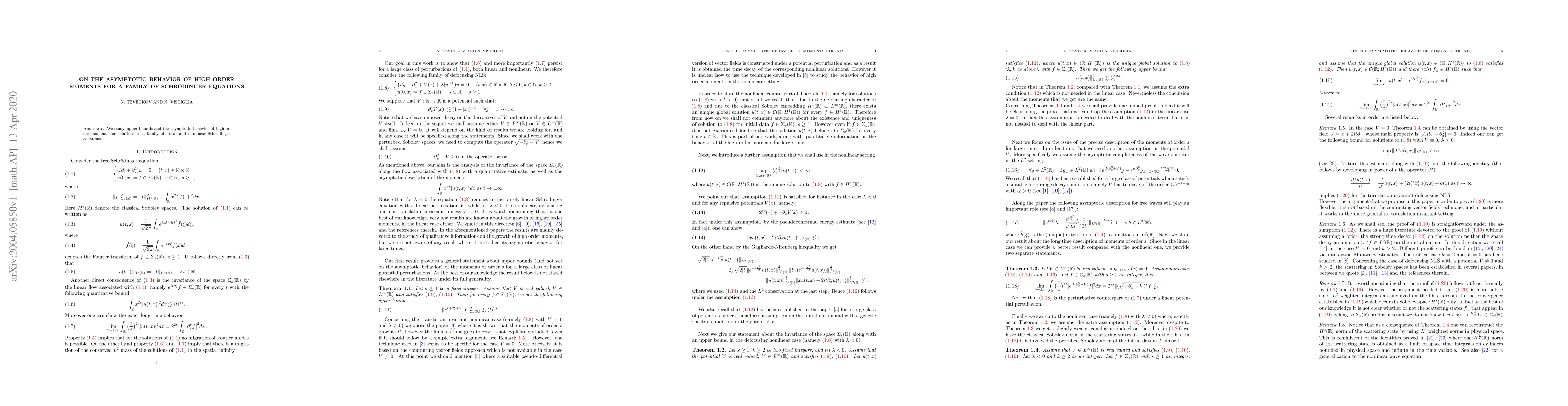 We study upper bounds and the asymptotic behavior of high order moments for solutions to a family of linear and nonlinear Schroedinger equations.