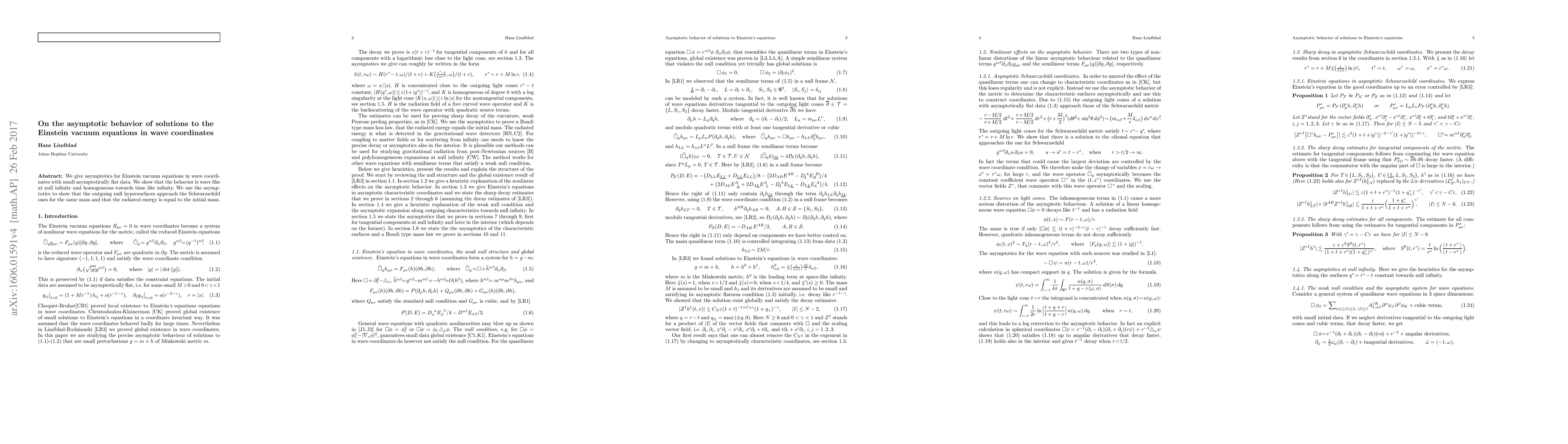 This paper investigates the asymptotic behavior of solutions to Einstein's vacuum equations in wave coordinates, demonstrating wave-like characteristics at null infinity and homogeneity towards timelike infinity. It concludes that outgoing null hypersurfaces converge to Schwarzschild ones for the same mass, with radiated energy equating to the initial mass.