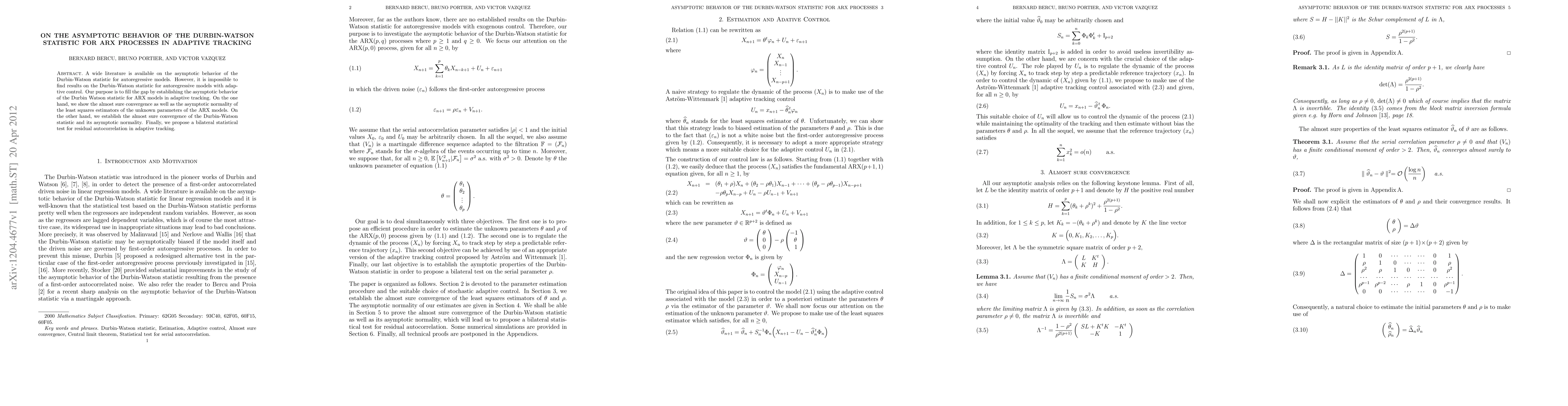 This paper investigates the asymptotic behavior of the Durbin-Watson statistic for ARX models under adaptive control, establishing its almost sure convergence and asymptotic normality. It also proposes a bilateral statistical test for residual autocorrelation in adaptive tracking.