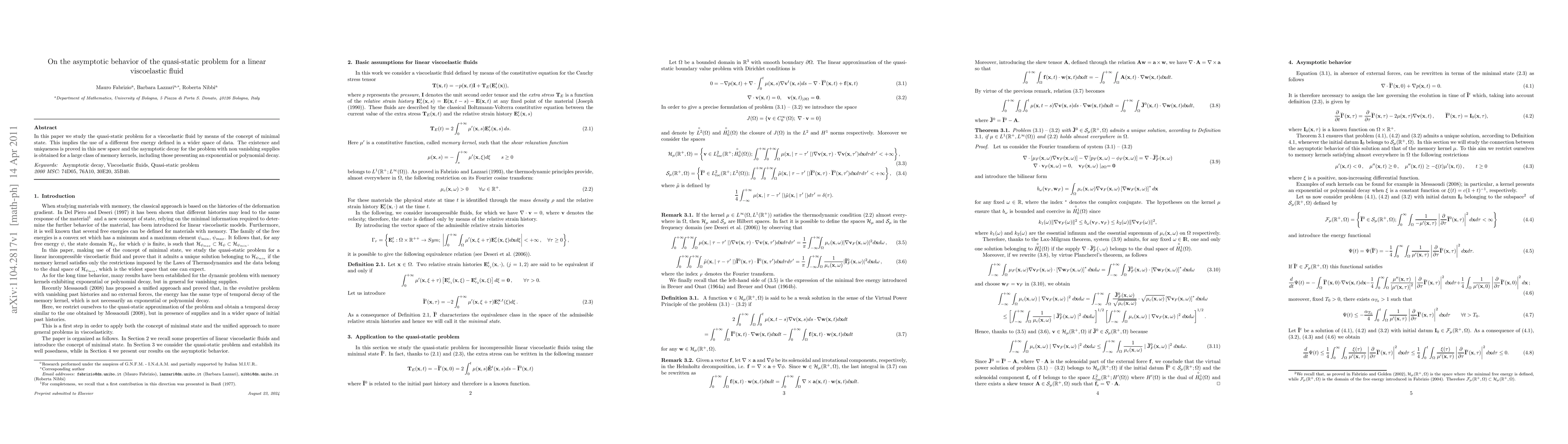 In this paper we study the quasi-static problem for a viscoelastic fluid by means of the concept of minimal state. This implies the use of a different free energy defined in a wider space of data. The existence and uniqueness is proved in this new space and the asymptotic decay for the problem with non vanishing supplies is obtained for a large class of memory kernels, including those presenting an exponential or polynomial decay.