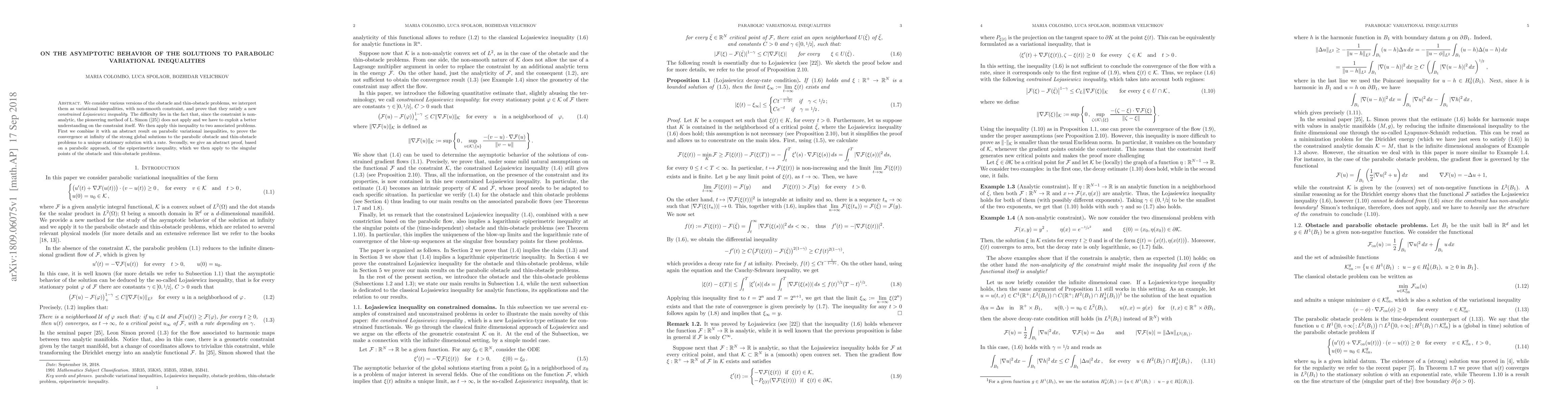 This paper explores the asymptotic behavior of solutions to parabolic variational inequalities, particularly obstacle and thin-obstacle problems, proving a new constrained Lojasiewicz inequality due to the non-analytic nature of the constraint. It demonstrates the convergence of strong global solutions to a unique stationary solution and provides an abstract proof of the epiperimetric inequality.