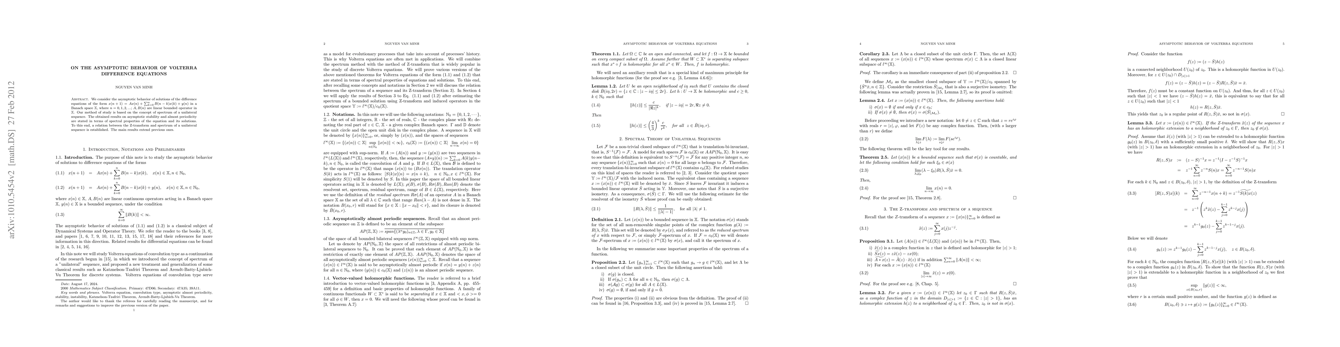 We consider the asymptotic behavior of solutions of the difference equations of the form $x(n+1)=Ax(n) + \sum_{k=0}^n B(n-k)x(k) + y(n)$ in a Banach space $\X$, where $n=0,1,2,...$; $A,B(n)$ are linear bounded operator in $\X$. Our method of study is based on the concept of spectrum of a unilateral sequence. The obtained results on asymptotic stability and almost periodicity are stated in terms of spectral properties of the equation and its solutions. To this end, a relation between the Z-transform and spectrum of a unilateral sequence is established. The main results extend previous ones.