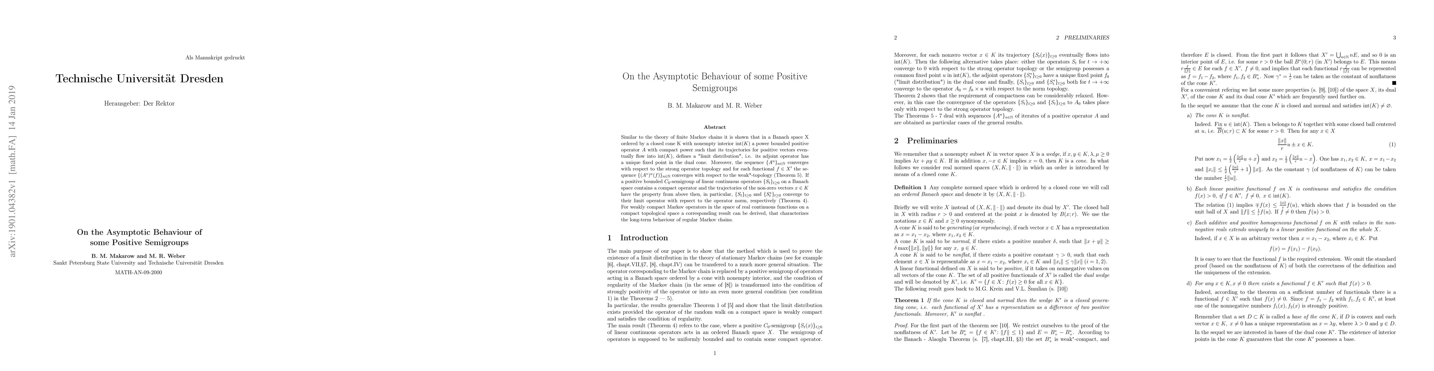 Similar to the theory of finite Markov chains it is shown that in a Banach space $X$ ordered by a closed cone $K$ with nonempty interior int($K$) a power bounded positive operator $A$ with compact power such that its trajectories for positive vectors eventually flow into int($K$), defines a "limit distribution", i.e. its adjoint operator has a unique fixed point in the dual cone. Moreover, the sequence (A^n) converges with respect to the strong operator topology and for each functional $f\in X'$ the sequence $((A^*)^n(f))$ converges with respect to the weak*-topology (Theorem 5). If a positive bounded $C_0$-semigroup of linear continuous operators $(S_t)_{t\geq 0}$ on a Banach space contains a compact operator and the trajectories of the non-zero vectors $x\in K$ have the property from above then, in particular, $(S_t)$ and $(S^*_t)$ converge to their limit operator with repsect to the operator norm, respectively (Theorem 4). For weakly compact Markov operators in the space of real continuous functions on a compact topological space a corresponding result can be derived, that characterizes the long-term behaviour of regular Markov chains.