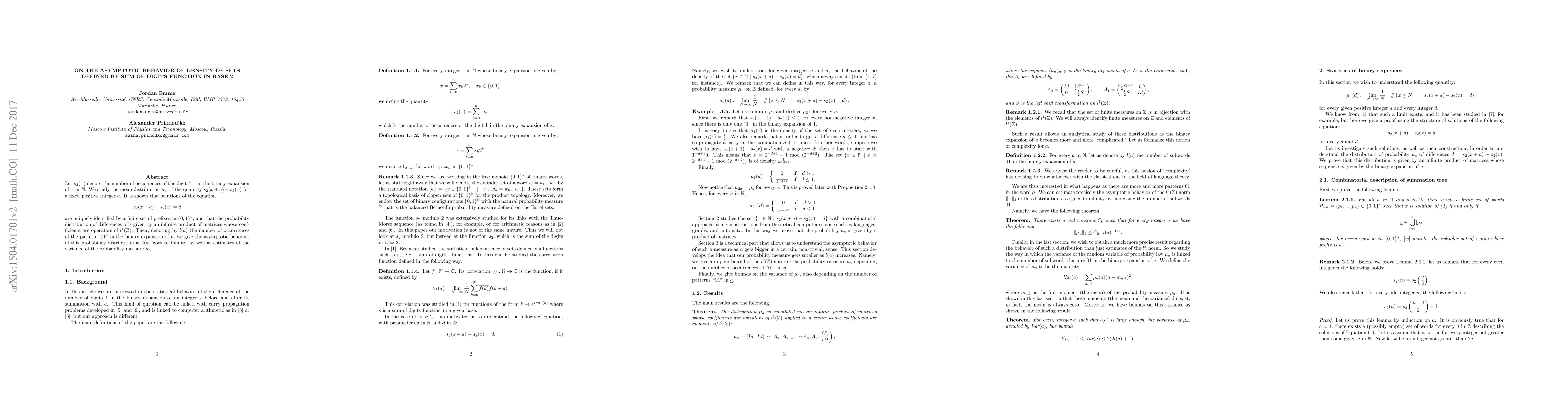Let $s\_2(x)$ denote the number of digits "$1$" in a binary expansion of any $x \in \mathbb{N}$. We study the mean distribution $\mu\_a$ of the quantity $s\_2(x+a)-s\_2(x)$ for a fixed positive integer $a$.It is shown that solutions of the equation$$ s\_2(x+a)-s\_2(x)= d $$are uniquely identified by a finite set of prefixes in $\{0,1\}^*$, and that the probability distribution of differences $d$ is given by an infinite product of matrices whose coefficients are operators of $l^1(\mathbb{Z})$.Then, denoting by $l(a)$ the number of patterns "$01$" in the binary expansion of $a$, we give the asymptotic behaviour of this probability distribution as $l(a)$ goes to infinity as well as estimates of the variance of the probability measure $\mu\_a$