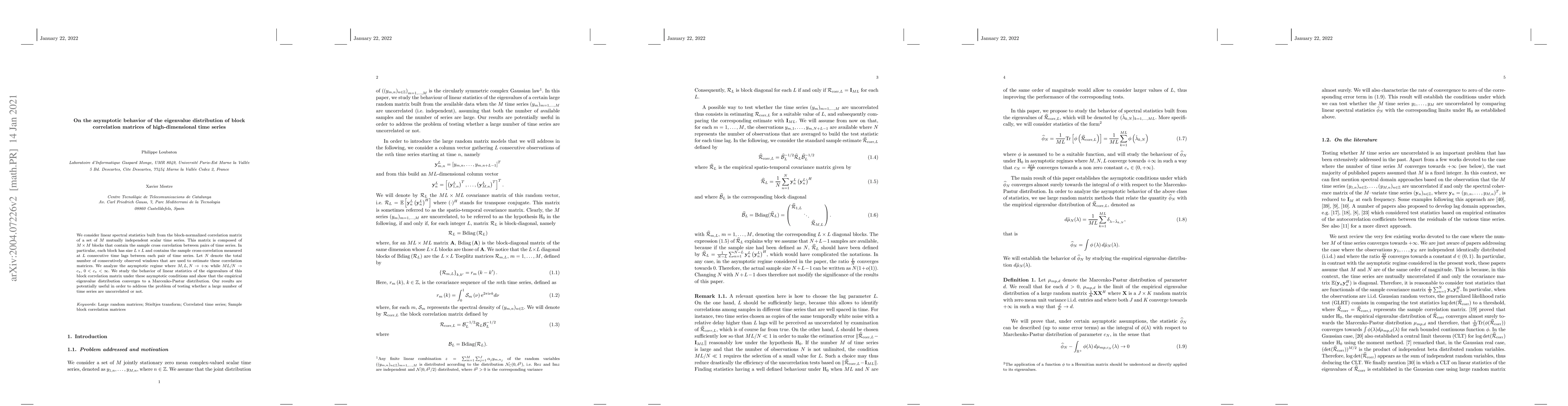 This paper investigates the asymptotic behavior of the eigenvalue distribution of block correlation matrices derived from high-dimensional time series. It demonstrates that under certain asymptotic conditions, the empirical eigenvalue distribution converges to a Marcenko-Pastur distribution, which is useful for testing the correlation among large sets of time series.