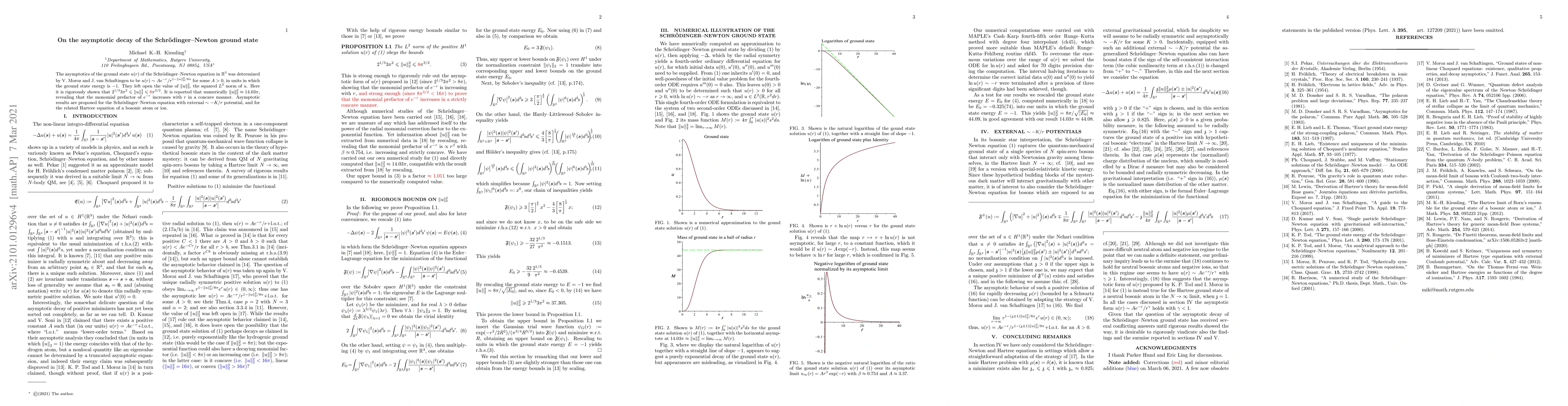 This paper refines the asymptotic decay of the Schr"odinger--Newton ground state, determining a range for its squared L2 norm, and proposes results for related equations with external potentials.